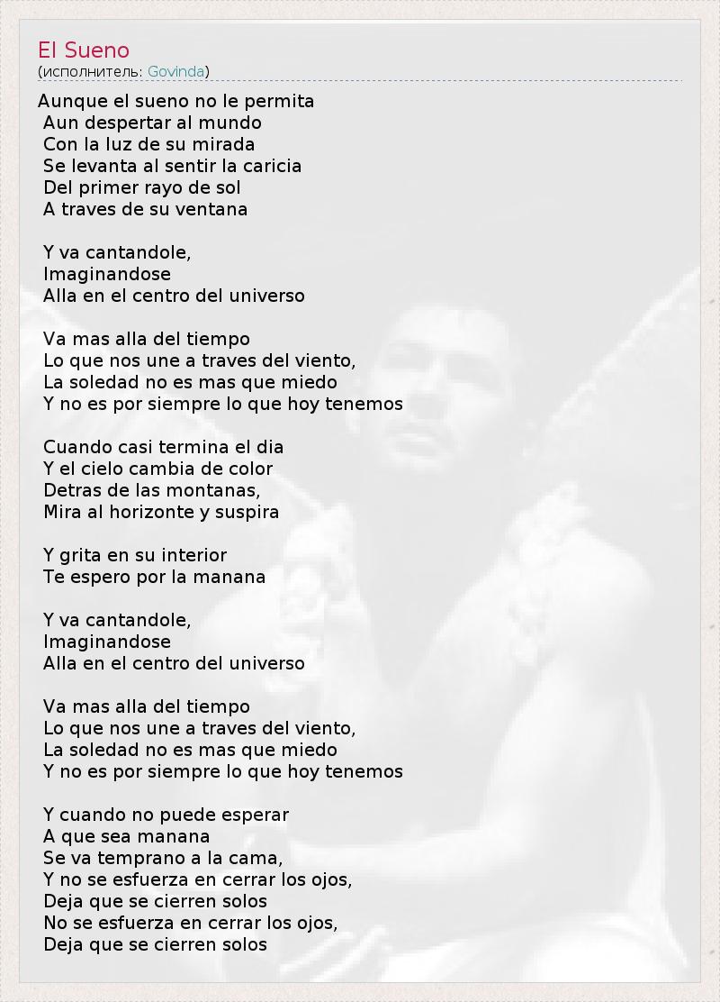 Aunque el sueno no le permita Aun despertar al mundo Con la luz de su mirada Se levanta al sentir la caricia Del primer rayo de sol A traves de su ventana Y va cantandole, Imaginandose Alla en el centro del universo Va mas alla del tiempo Lo que nos une a traves del viento, La soledad no es mas que miedo Y no es por siempre lo que hoy tenemos Cuando casi termina el dia Y el cielo cambia de color Detras de las montanas, Mira al horizonte y suspira Y grita en su interior Te espero por la manana Y va cantandole, Imaginandose Alla en el centro del universo Va mas alla del tiempo Lo que nos une a traves del viento, La soledad no es mas que miedo Y no es por siempre lo que hoy tenemos Y cuando no puede esperar A que sea manana Se va temprano a la cama, Y no se esfuerza en cerrar los ojos, Deja que se cierren solos No se esfuerza en cerrar los ojos, Deja que se cierren solos