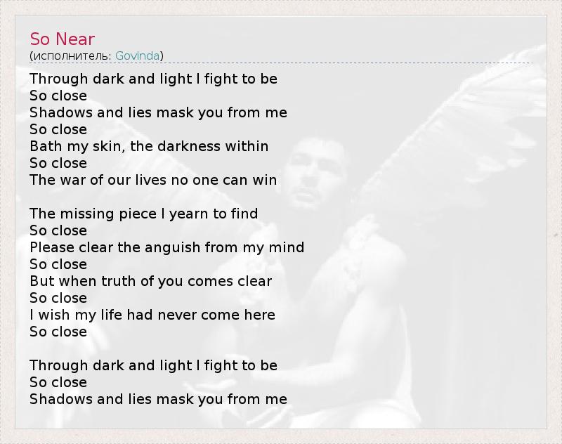 Я сражаюсь с тьмой и светом, чтобы Быть ближе. Тени и ложь прячут тебя от меня – Так близко. Окуни меня во тьму – Такую близкую. В войне, что мы ведем, никто не сможет победить. Недостающий кусочек головоломки, что я мечтаю найти - Уже так близко. Прошу, очисть мои мысли от боли, Что так близка. Когда твоё истинное лицо почти Становится явным, Хотелось бы мне никогда не приближаться Так близко. Я сражаюсь с тьмой и светом, чтобы Быть ближе. Тени и ложь прячут тебя от меня