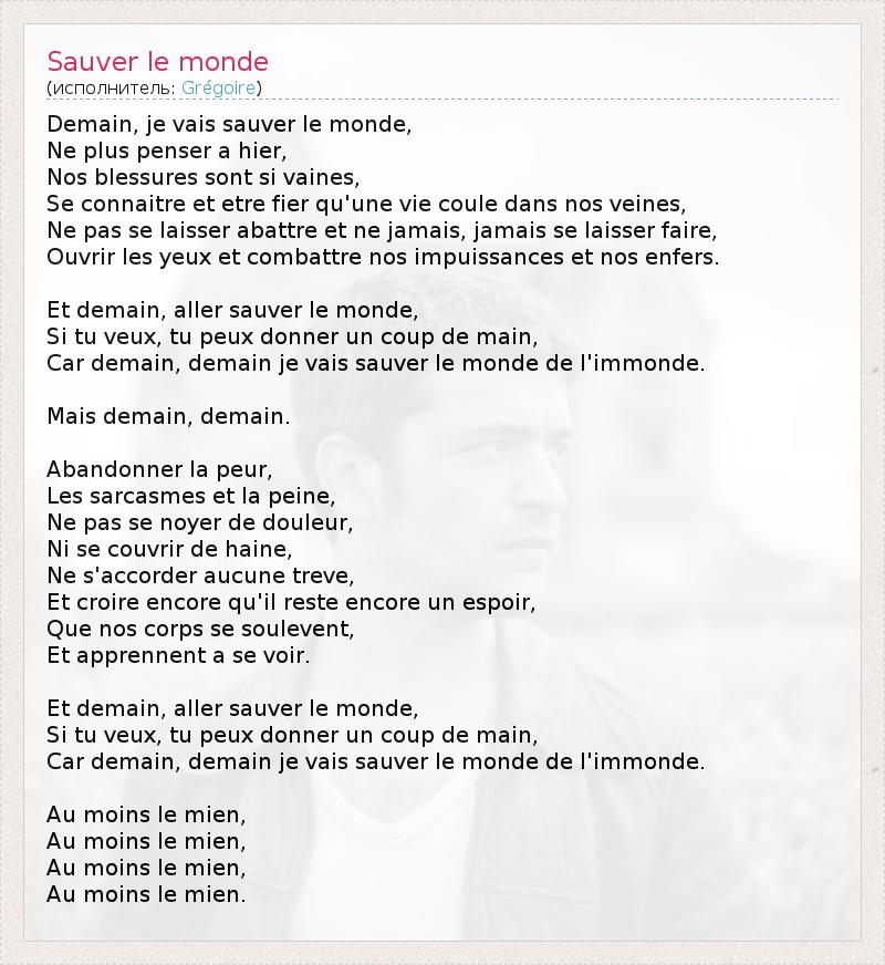 Завтра я спасу мир, Не думая больше о вчерашнем, Наши обиды пустые, Знать друг друга и быть гордым, что жизнь бежит в наших венах, Не поддаваться унынию и никогда, никогда не давать себя обмануть, Открыть глаза и сражаться со своим бессилием и своими мучениями. И завтра, давайте спасать мир, Если ты хочешь, ты можешь помочь, Потому что завтра, завтра я спасу мир от подлости. Но завтра, завтра Покинуть страх, Сарказм и боль, Не тонуть в горе, Не покрывать себя ненавистью, Не давать себе никакой поблажки И всё ещё верить, что ещё есть надежда, Что наши тела волнуются И учатся смотреть на себя. И завтра, давайте спасать мир, Если ты хочешь, ты можешь помочь, Потому что завтра, завтра я спасу мир от подлости. Хотя бы свой собственный, Хотя бы свой собственный, Хотя бы свой собственный, Хотя бы свой собственный мир...
