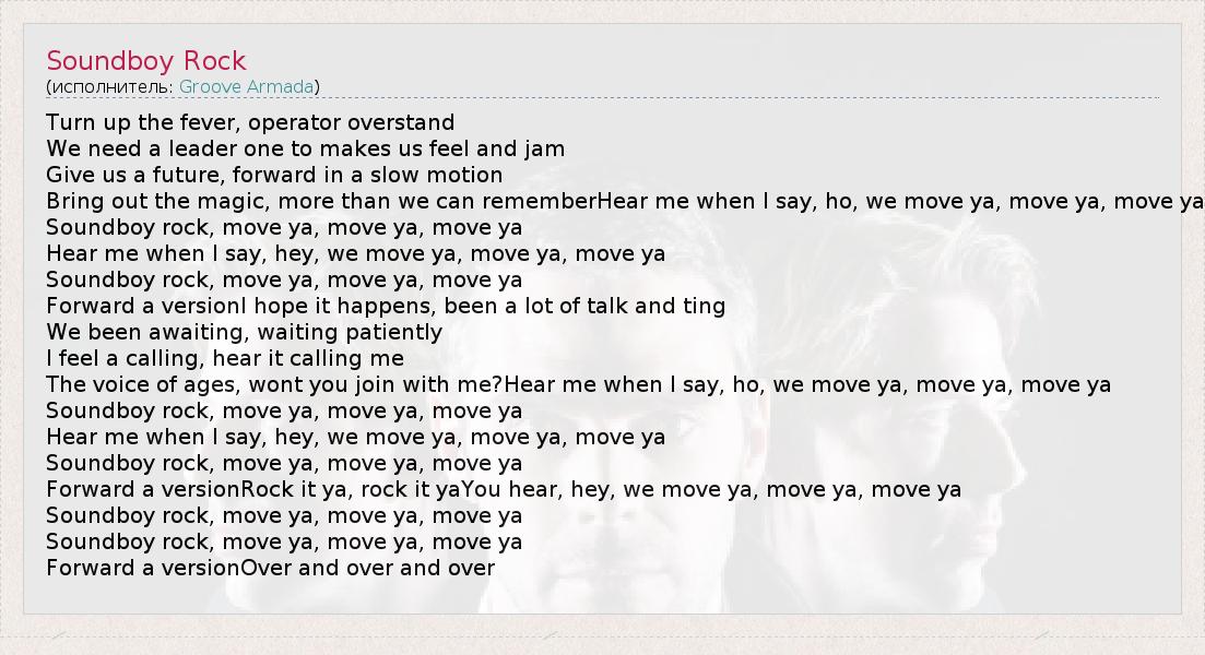 Это интересно:Лондонский электронно-танцевальный дуэт Groove Armada был сформирован в середине 90-х ди-джеями и мультиинструменталистами Томом Финдли (Tom Findlay) и Энди Като (Andy Cato). Коллектив начал выступления в собственном клубе, названном так же, как и группа - Groove Armada (в честь одноименной дискотеки, функционировавшей в 70-е в Ньюкасле). В одной комнате Энди играл хаус, в другой Том заводил фанк. Затем они съехались... продолжение