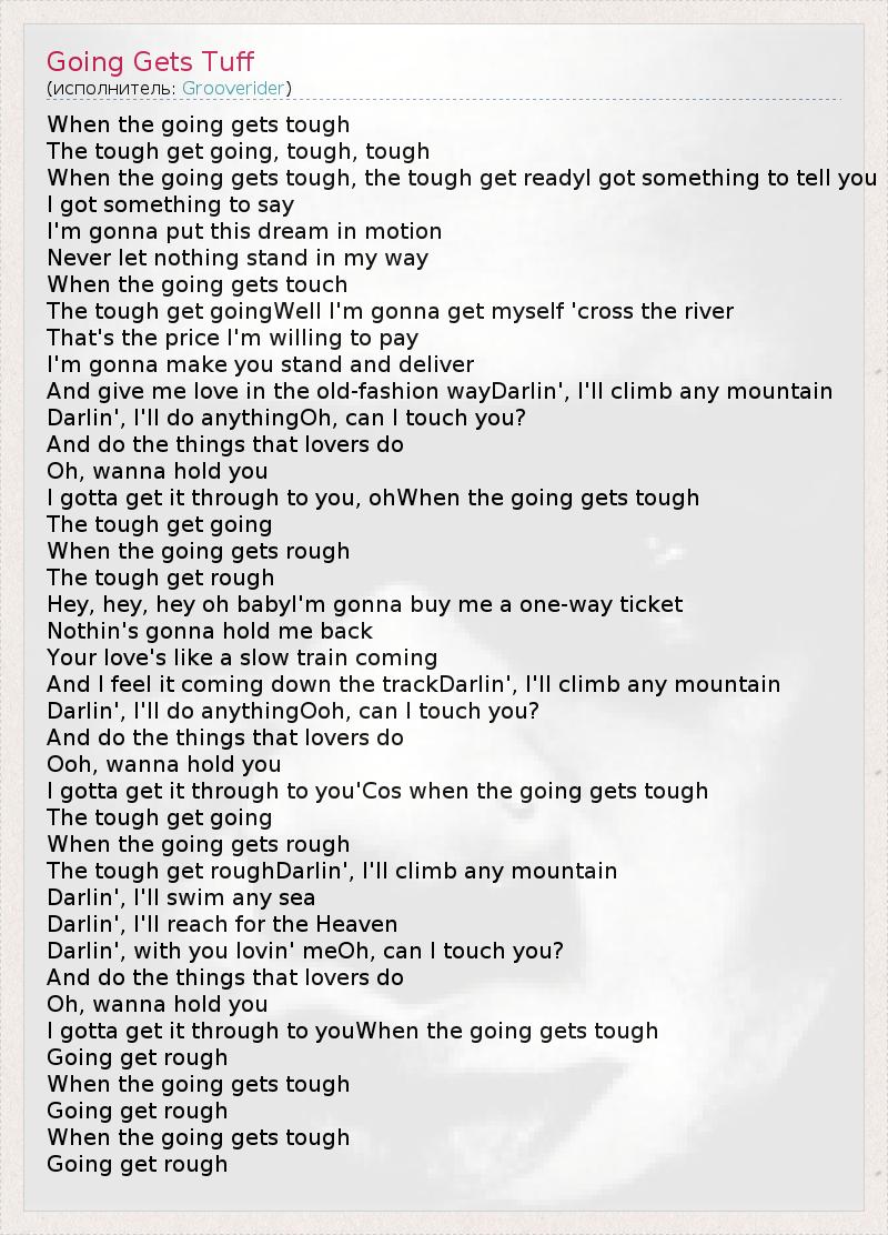When the going gets tough The tough get going, tough, tough When the going gets tough, the tough get readyI got something to tell you I got something to say I'm gonna put this dream in motion Never let nothing stand in my way When the going gets touch The tough get goingWell I'm gonna get myself 'cross the river That's the price I'm willing to pay I'm gonna make you stand and deliver And give me love in the old-fashion wayDarlin', I'll climb any mountain Darlin', I'll do anythingOh, can I touch you? And do the things that lovers do Oh, wanna hold you I gotta get it through to you, ohWhen the going gets tough The tough get going When the going gets rough The tough get rough Hey, hey, hey oh babyI'm gonna buy me a one-way ticket Nothin's gonna hold me back Your love's like a slow train coming And I feel it coming down the trackDarlin', I'll climb any mountain Darlin', I'll do anythingOoh, can I touch you? And do the things that lovers do Ooh, wanna hold you I gotta get it through to you'Cos when the going gets tough The tough get going When the going gets rough The tough get roughDarlin', I'll climb any mountain Darlin', I'll swim any sea Darlin', I'll reach for the Heaven Darlin', with you lovin' meOh, can I touch you? And do the things that lovers do Oh, wanna hold you I gotta get it through to youWhen the going gets tough Going get rough When the going gets tough Going get rough When the going gets tough Going get rough