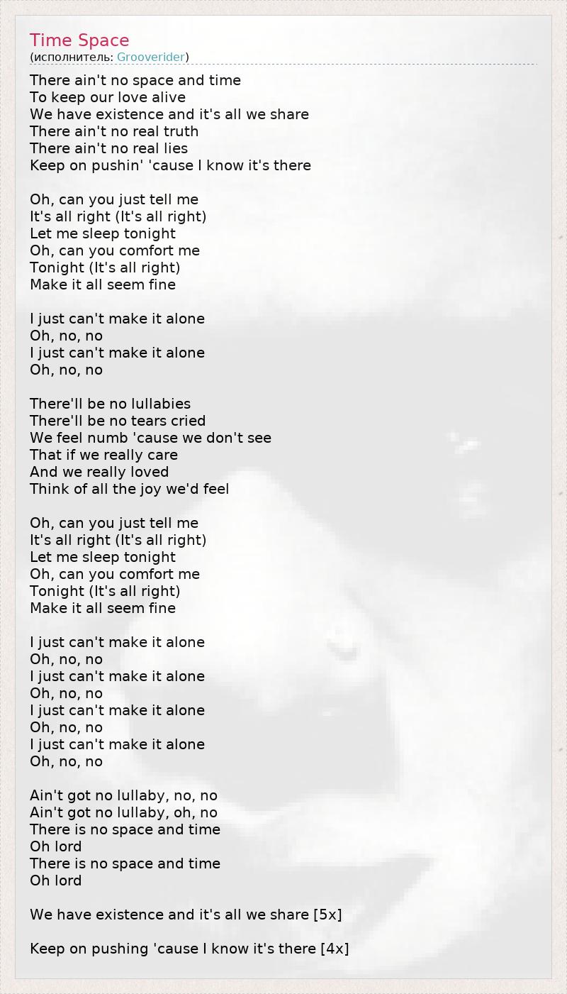 There ain't no space and time To keep our love alive We have existence and it's all we share There ain't no real truth There ain't no real lies Keep on pushin' 'cause I know it's there Oh, can you just tell me It's all right (It's all right) Let me sleep tonight Oh, can you comfort me Tonight (It's all right) Make it all seem fine I just can't make it alone Oh, no, no I just can't make it alone Oh, no, no There'll be no lullabies There'll be no tears cried We feel numb 'cause we don't see That if we really care And we really loved Think of all the joy we'd feel Oh, can you just tell me It's all right (It's all right) Let me sleep tonight Oh, can you comfort me Tonight (It's all right) Make it all seem fine I just can't make it alone Oh, no, no I just can't make it alone Oh, no, no I just can't make it alone Oh, no, no I just can't make it alone Oh, no, no Ain't got no lullaby, no, no Ain't got no lullaby, oh, no There is no space and time Oh lord There is no space and time Oh lord We have existence and it's all we share [5x] Keep on pushing 'cause I know it's there [4x]
