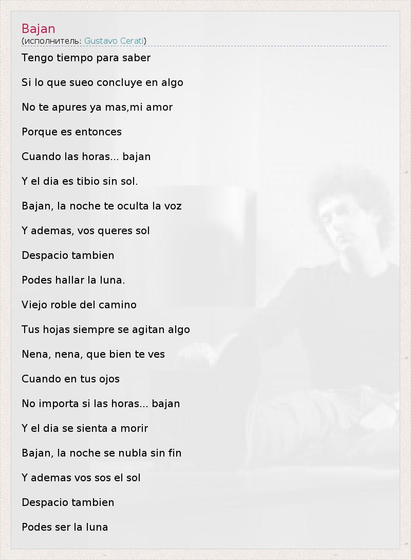 Это интересно:Gustavo Adrián Cerati Clark - Густаво Серати (родился в Буэнос-Айресе, 11 августа 1959 года). Аргентинский певец, композитор и гитарист. В 80-90-ые годы входил в состав известной аргентинской рок-группы Soda Stereo, вместе с Чарли Альберти (Charly Alberti) и Зета Босио (Zeta Bosio). После распада группы начал сольную карьеру с дебютным альбомом "Amor Amarillo" (в записи заглавного трека принял участие и Hector (Zeta)... продолжение