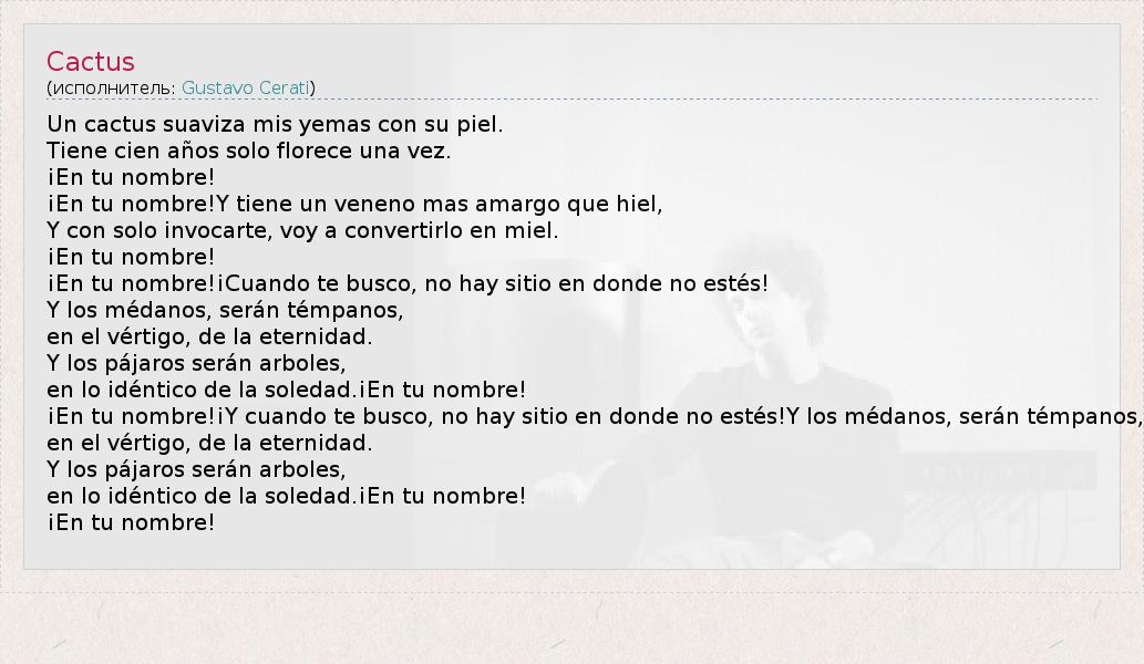 Это интересно:Gustavo Adrián Cerati Clark - Густаво Серати (родился в Буэнос-Айресе, 11 августа 1959 года). Аргентинский певец, композитор и гитарист. В 80-90-ые годы входил в состав известной аргентинской рок-группы Soda Stereo, вместе с Чарли Альберти (Charly Alberti) и Зета Босио (Zeta Bosio). После распада группы начал сольную карьеру с дебютным альбомом "Amor Amarillo" (в записи заглавного трека принял участие и Hector (Zeta)... продолжение