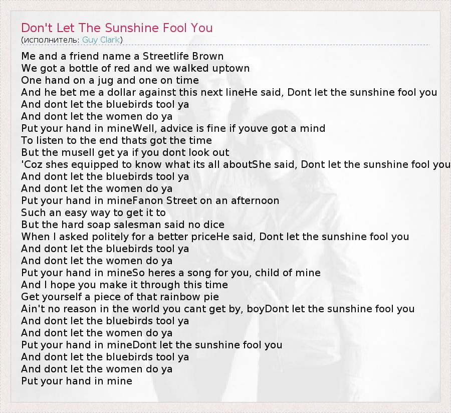 Me and a friend name a Streetlife Brown We got a bottle of red and we walked uptown One hand on a jug and one on time And he bet me a dollar against this next lineHe said, Dont let the sunshine fool you And dont let the bluebirds tool ya And dont let the women do ya Put your hand in mineWell, advice is fine if youve got a mind To listen to the end thats got the time But the musell get ya if you dont look out 'Coz shes equipped to know what its all aboutShe said, Dont let the sunshine fool you And dont let the bluebirds tool ya And dont let the women do ya Put your hand in mineFanon Street on an afternoon Such an easy way to get it to But the hard soap salesman said no dice When I asked politely for a better priceHe said, Dont let the sunshine fool you And dont let the bluebirds tool ya And dont let the women do ya Put your hand in mineSo heres a song for you, child of mine And I hope you make it through this time Get yourself a piece of that rainbow pie Ain't no reason in the world you cant get by, boyDont let the sunshine fool you And dont let the bluebirds tool ya And dont let the women do ya Put your hand in mineDont let the sunshine fool you And dont let the bluebirds tool ya And dont let the women do ya Put your hand in mine