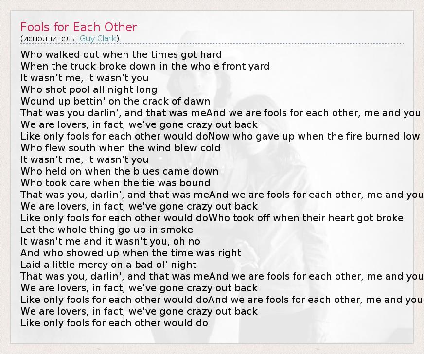 Who walked out when the times got hard When the truck broke down in the whole front yard It wasn't me, it wasn't you Who shot pool all night long Wound up bettin' on the crack of dawn That was you darlin', and that was meAnd we are fools for each other, me and you We are lovers, in fact, we've gone crazy out back Like only fools for each other would doNow who gave up when the fire burned low Who flew south when the wind blew cold It wasn't me, it wasn't you Who held on when the blues came down Who took care when the tie was bound That was you, darlin', and that was meAnd we are fools for each other, me and you We are lovers, in fact, we've gone crazy out back Like only fools for each other would doWho took off when their heart got broke Let the whole thing go up in smoke It wasn't me and it wasn't you, oh no And who showed up when the time was right Laid a little mercy on a bad ol' night That was you, darlin', and that was meAnd we are fools for each other, me and you We are lovers, in fact, we've gone crazy out back Like only fools for each other would doAnd we are fools for each other, me and you We are lovers, in fact, we've gone crazy out back Like only fools for each other would do