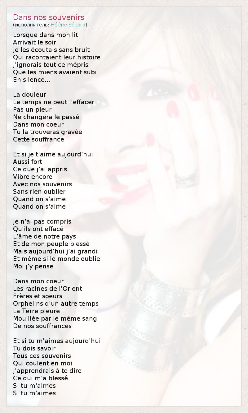 Lorsque dans mon lit Arrivait le soir Je les écoutais sans bruit Qui racontaient leur histoire J'ignorais tout ce mépris Que les miens avaient subi En silence... La douleur Le temps ne peut l'effacer Pas un pleur Ne changera le passé Dans mon coeur Tu la trouveras gravée Cette souffrance Et si je t'aime aujourd'hui Aussi fort Ce que j'ai appris Vibre encore Avec nos souvenirs Sans rien oublier Quand on s'aime Quand on s'aime Je n'ai pas compris Qu'ils ont effacé L'âme de notre pays Et de mon peuple blessé Mais aujourd'hui j'ai grandi Et même si le monde oublie Moi j'y pense Dans mon coeur Les racines de l'Orient Frères et soeurs Orphelins d'un autre temps La Terre pleure Mouillée par le même sang De nos souffrances Et si tu m'aimes aujourd'hui Tu dois savoir Tous ces souvenirs Qui coulent en moi J'apprendrais à te dire Ce qui m'a blessé Si tu m'aimes Si tu m'aimes