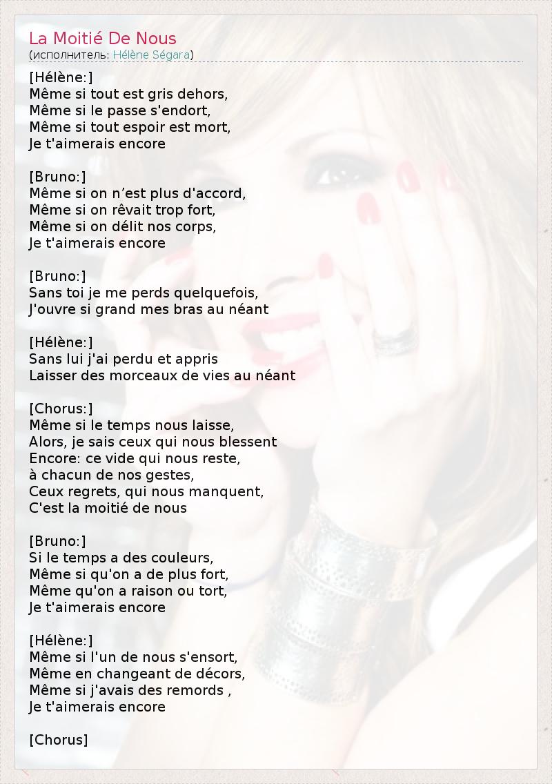 [Элен:] Даже если всё снаружи серо, Даже если прошлое дремлет, Даже если всякая надежда мертва, Я все равно любила бы тебя [Бруно:] Даже если меж нами больше нет согласия, Даже если мы слишком много мечтали, Даже если наши тела теперь свободны, Я все равно любил бы тебя [Бруно:] Без тебя я порой теряюсь, Распахиваю объятья навстречу небытию [Элен:] Без него я потеряна и научилась Осколки жизни оставлять в небытие [Припев:] Даже если время оставило нас, Что ж, я знаю, что нас по-прежнему так ранит : эта пустота, что остается С каждым нашим движением, Эти сожаления, которых нам не хватает – Это половина нас самих [Бруно:] Это время пестрит красками, Даже если мы сильны, Даже если мы правы, даже если неправы, Я все равно любил бы тебя [Элен:] Даже если один из нас околдован, Даже если сменятся декорации, Даже если б я была полна сожалений, Я бы все равно продолжала любить тебя [Припев]