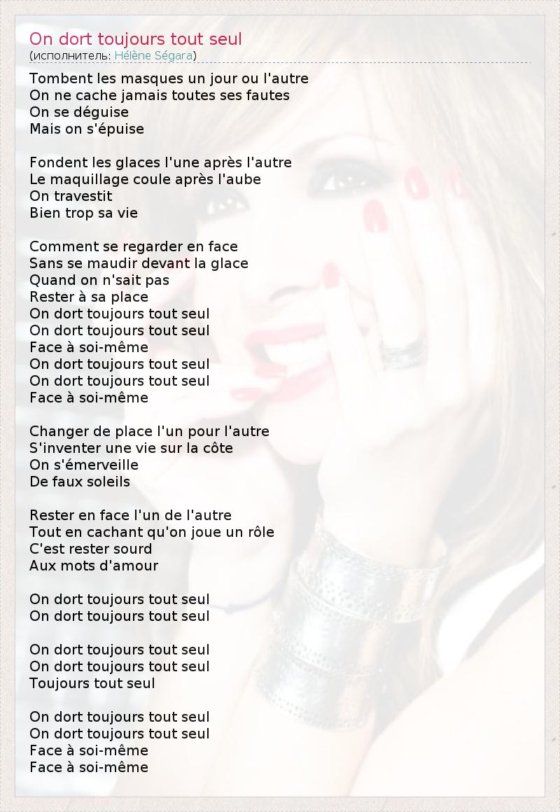 Рано или поздно спадают маски, Все свои недостатки не скрыть, Мы прячемся под маску, Но истощаем себя этим Один за другим на нас слои льда, Грим стекает после рассвета, Мы слишком сильно Извращаем свою жизнь Как смотреть в зеркало, Не проклиная себя? Когда мы не можем больше оставаться Там, где мы есть, Мы всегда спим в полном одиночестве, Мы всегда спим одни, Повернувшись к самим себе, Мы всегда спим в полном одиночестве, Мы всегда спим одни, Повернувшись к самим себе Менять друг ради друга места, Придумывать жизнь на побережье, Мы в восхищении От ненастоящих солнц Оставаться лицом к лицу, Скрывая то, что играем роль, Это означает оставаться глухими К словам любви Мы всегда спим в полном одиночестве, Мы всегда спим одни Мы всегда спим в полном одиночестве, Мы всегда спим одни, Всегда в полном одиночестве Мы всегда спим в полном одиночестве, Мы всегда спим одни, Повернувшись к самим себе, Повернувшись к самим себе