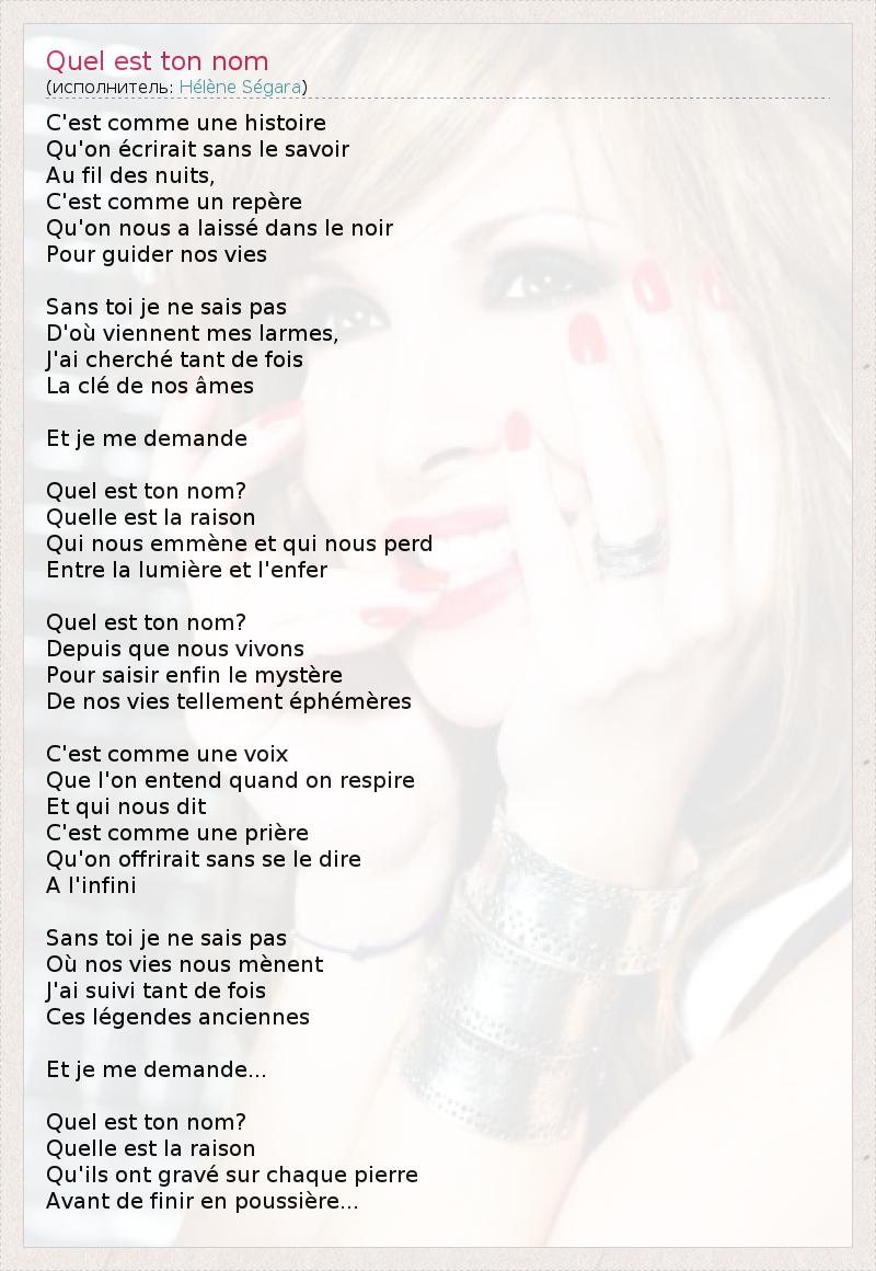 Это словно история, Которую мы писали б, не ведая сами, Ночь за ночью, Это как ориентир, Оставленный нам в темноте, Чтоб направлять наши жизни Без тебя я не знаю Причины своих слез, Я столько раз искала Ключ, что открыл бы наши души И я себя спрашиваю Как твоё имя? И в чем смысл того, Что уводит нас, чтоб погубить Между светом и адом Как твоё имя? С самого начала мы живем, Чтоб наконец познать тайну Наших жизней, таких недолговечных Это словно голос, Что мы слышим, когда дышим, И что говорит нам, Это словно молитва, Которую мы бы произнесли бы В вечности, не признаваясь себе в этом Я не знаю без тебя, Куда ведут нас наши жизни, Я столько раз следовала За этими древними легендами И я спрашиваю себя… Как твоё имя? И в чем смысл того, Что выгравировали на каждом камне, Прежде чем обратиться в прах...