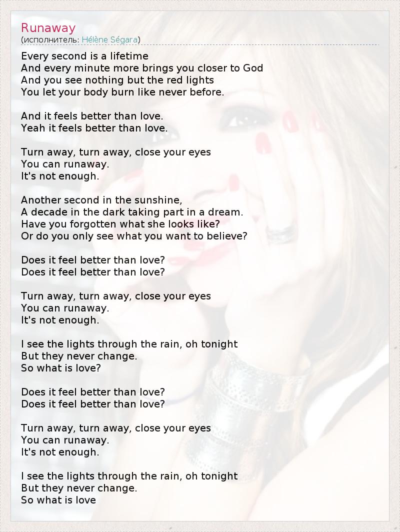 Every second is a lifetime And every minute more brings you closer to God And you see nothing but the red lights You let your body burn like never before. And it feels better than love. Yeah it feels better than love. Turn away, turn away, close your eyes You can runaway. It's not enough. Another second in the sunshine, A decade in the dark taking part in a dream. Have you forgotten what she looks like? Or do you only see what you want to believe? Does it feel better than love? Does it feel better than love? Turn away, turn away, close your eyes You can runaway. It's not enough. I see the lights through the rain, oh tonight But they never change. So what is love? Does it feel better than love? Does it feel better than love? Turn away, turn away, close your eyes You can runaway. It's not enough. I see the lights through the rain, oh tonight But they never change. So what is love