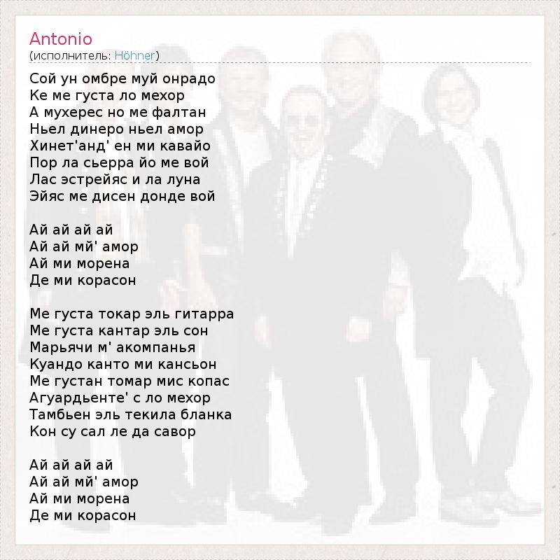 Сой ун омбре муй онрадо Ке ме густа ло мехор А мухерес но ме фалтан Ньел динеро ньел амор Хинет'анд' ен ми кавайо Пор ла сьерра йо ме вой Лас эстрейяс и ла луна Эйяс ме дисен донде вой Ай ай ай ай Ай ай мй' амор Ай ми морена Де ми корасон Ме густа токар эль гитарра Ме густа кантар эль сон Марьячи м' акомпанья Куандо канто ми кансьон Ме густан томар мис копас Агуардьенте' c ло мехор Тамбьен эль текила бланка Кон су сал ле да савор Ай ай ай ай Ай ай мй' амор Ай ми морена Де ми корасон