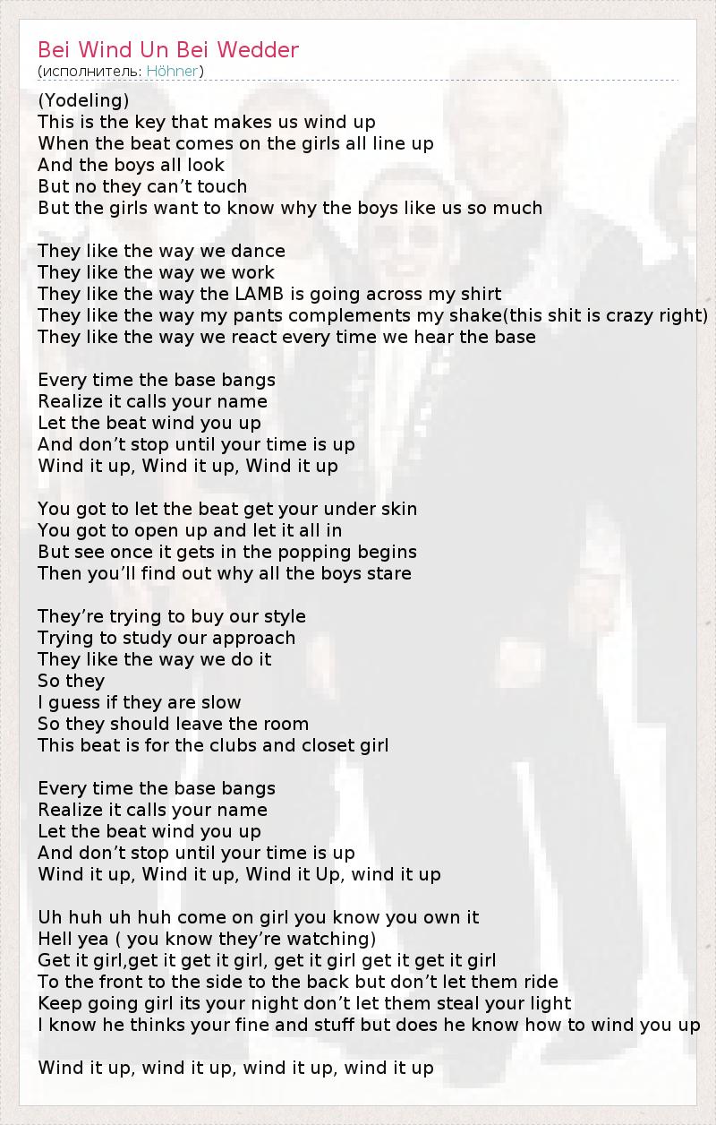 (Yodeling) This is the key that makes us wind up When the beat comes on the girls all line up And the boys all look But no they can’t touch But the girls want to know why the boys like us so much They like the way we dance They like the way we work They like the way the LAMB is going across my shirt They like the way my pants complements my shake(this shit is crazy right) They like the way we react every time we hear the base Every time the base bangs Realize it calls your name Let the beat wind you up And don’t stop until your time is up Wind it up, Wind it up, Wind it up You got to let the beat get your under skin You got to open up and let it all in But see once it gets in the popping begins Then you’ll find out why all the boys stare They’re trying to buy our style Trying to study our approach They like the way we do it So they I guess if they are slow So they should leave the room This beat is for the clubs and closet girl Every time the base bangs Realize it calls your name Let the beat wind you up And don’t stop until your time is up Wind it up, Wind it up, Wind it Up, wind it up Uh huh uh huh come on girl you know you own it Hell yea ( you know they’re watching) Get it girl,get it get it girl, get it girl get it get it girl To the front to the side to the back but don’t let them ride Keep going girl its your night don’t let them steal your light I know he thinks your fine and stuff but does he know how to wind you up Wind it up, wind it up, wind it up, wind it up