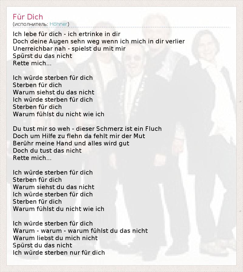 Ich lebe für dich - ich ertrinke in dir Doch deine Augen sehn weg wenn ich mich in dir verlier Unerreichbar nah - spielst du mit mir Spürst du das nicht Rette mich... Ich würde sterben für dich Sterben für dich Warum siehst du das nicht Ich würde sterben für dich Sterben für dich Warum fühlst du nicht wie ich Du tust mir so weh - dieser Schmerz ist ein Fluch Doch um Hilfe zu flehn da fehlt mir der Mut Berühr meine Hand und alles wird gut Doch du tust das nicht Rette mich... Ich würde sterben für dich Sterben für dich Warum siehst du das nicht Ich würde sterben für dich Sterben für dich Warum fühlst du nicht wie ich Ich würde sterben für dich Warum - warum - warum fühlst du das nicht Warum liebst du mich nicht Spürst du das nicht Ich würde sterben nur für dich