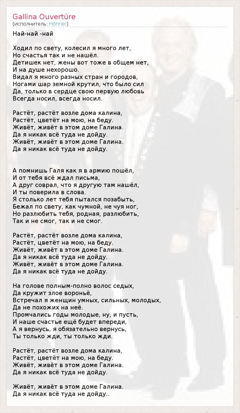 Най-най -най Ходил по свету, колесил я много лет, Но счастья так и не нашёл. Детишек нет, жены вот тоже в общем нет, И на душе нехорошо. Видал я много разных стран и городов, Ногами шар земной крутил, что было сил Да, только в сердце свою первую любовь Всегда носил, всегда носил. Растёт, растёт возле дома калина, Растёт, цветёт на мою, на беду. Живёт, живёт в этом доме Галина. Да я никак всё туда не дойду. Живёт, живёт в этом доме Галина. Да я никак всё туда не дойду. А помнишь Галя как я в армию пошёл, И от тебя всё ждал письма, А друг соврал, что я другую там нашёл, И ты поверила в слова. Я столько лет тебя пытался позабыть, Бежал по свету, как чумной, не чуя ног, Но разлюбить тебя, родная, разлюбить, Так и не смог, так и не смог. Растёт, растёт возле дома калина, Растёт, цветёт на мою, на беду. Живёт, живёт в этом доме Галина. Да я никак всё туда не дойду. Живёт, живёт в этом доме Галина. Да я никак всё туда не дойду. На голове полным-полно волос седых, Да кружит злое вороньё, Встречал я женщин умных, сильных, молодых, Да не похожих на неё. Промчались годы молодые, ну, и пусть, И наше счастье ещё будет впереди, А я вернусь, я обязательно вернусь, Ты только жди, ты только жди. Растёт, растёт возле дома калина, Растёт, цветёт на мою, на беду. Живёт, живёт в этом доме Галина. Да я никак всё туда не дойду. Живёт, живёт в этом доме Галина. Да я никак всё туда не дойду..