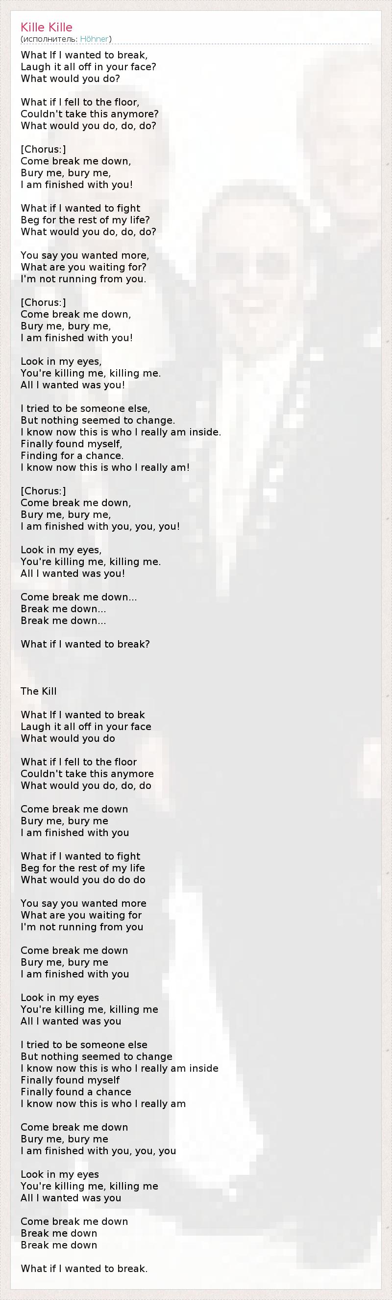 What If I wanted to break, Laugh it all off in your face? What would you do? What if I fell to the floor, Couldn't take this anymore? What would you do, do, do? [Chorus:] Come break me down, Bury me, bury me, I am finished with you! What if I wanted to fight Beg for the rest of my life? What would you do, do, do? You say you wanted more, What are you waiting for? I'm not running from you. [Chorus:] Come break me down, Bury me, bury me, I am finished with you! Look in my eyes, You're killing me, killing me. All I wanted was you! I tried to be someone else, But nothing seemed to change. I know now this is who I really am inside. Finally found myself, Finding for a chance. I know now this is who I really am! [Chorus:] Come break me down, Bury me, bury me, I am finished with you, you, you! Look in my eyes, You're killing me, killing me. All I wanted was you! Come break me down... Break me down... Break me down... What if I wanted to break? The Kill What If I wanted to break Laugh it all off in your face What would you do What if I fell to the floor Couldn't take this anymore What would you do, do, do Come break me down Bury me, bury me I am finished with you What if I wanted to fight Beg for the rest of my life What would you do do do You say you wanted more What are you waiting for I'm not running from you Come break me down Bury me, bury me I am finished with you Look in my eyes You're killing me, killing me All I wanted was you I tried to be someone else But nothing seemed to change I know now this is who I really am inside Finally found myself Finally found a chance I know now this is who I really am Come break me down Bury me, bury me I am finished with you, you, you Look in my eyes You're killing me, killing me All I wanted was you Come break me down Break me down Break me down What if I wanted to break.