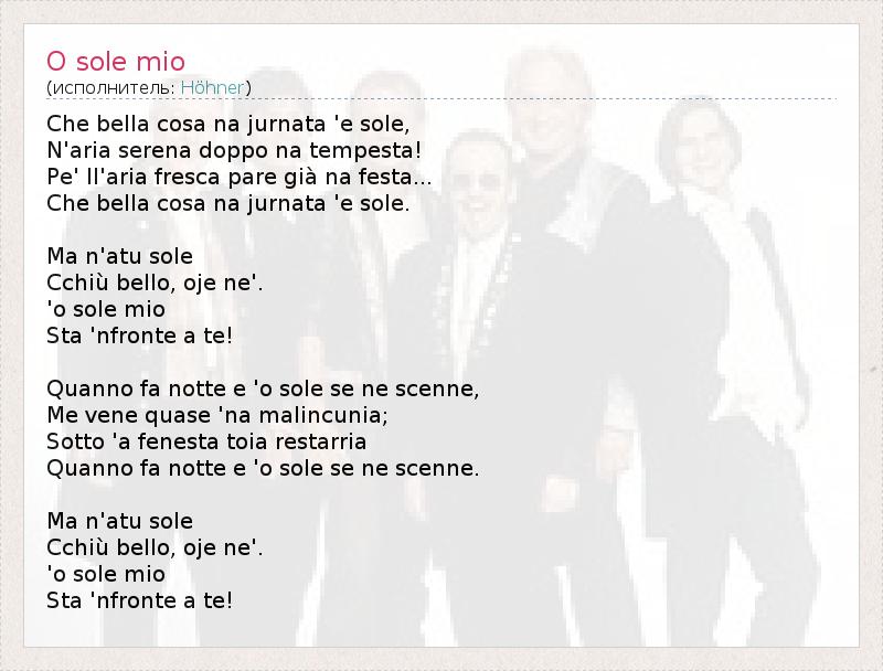 Che bella cosa na jurnata 'e sole, N'aria serena doppo na tempesta! Pe' ll'aria fresca pare già na festa... Che bella cosa na jurnata 'e sole. Ma n'atu sole Cchiù bello, oje ne'. 'o sole mio Sta 'nfronte a te! Quanno fa notte e 'o sole se ne scenne, Me vene quase 'na malincunia; Sotto 'a fenesta toia restarria Quanno fa notte e 'o sole se ne scenne. Ma n'atu sole Cchiù bello, oje ne'. 'o sole mio Sta 'nfronte a te!