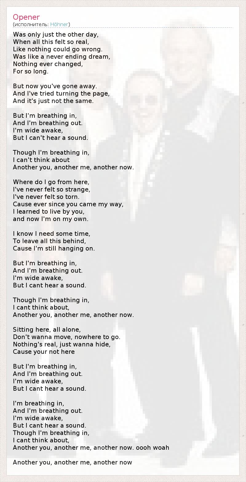 Was only just the other day, When all this felt so real, Like nothing could go wrong. Was like a never ending dream, Nothing ever changed, For so long. But now you've gone away. And I've tried turning the page, And it's just not the same. But I'm breathing in, And I'm breathing out. I'm wide awake, But I can't hear a sound. Though I'm breathing in, I can't think about Another you, another me, another now. Where do I go from here, I've never felt so strange, I've never felt so torn. Cause ever since you came my way, I learned to live by you, and now I'm on my own. I know I need some time, To leave all this behind, Cause I'm still hanging on. But I'm breathing in, And I'm breathing out. I'm wide awake, But I cant hear a sound. Though I'm breathing in, I cant think about, Another you, another me, another now. Sitting here, all alone, Don't wanna move, nowhere to go. Nothing's real, just wanna hide, Cause your not here But I'm breathing in, And I'm breathing out. I'm wide awake, But I cant hear a sound. I'm breathing in, And I'm breathing out. I'm wide awake, But I cant hear a sound. Though I'm breathing in, I cant think about, Another you, another me, another now. oooh woah Another you, another me, another now