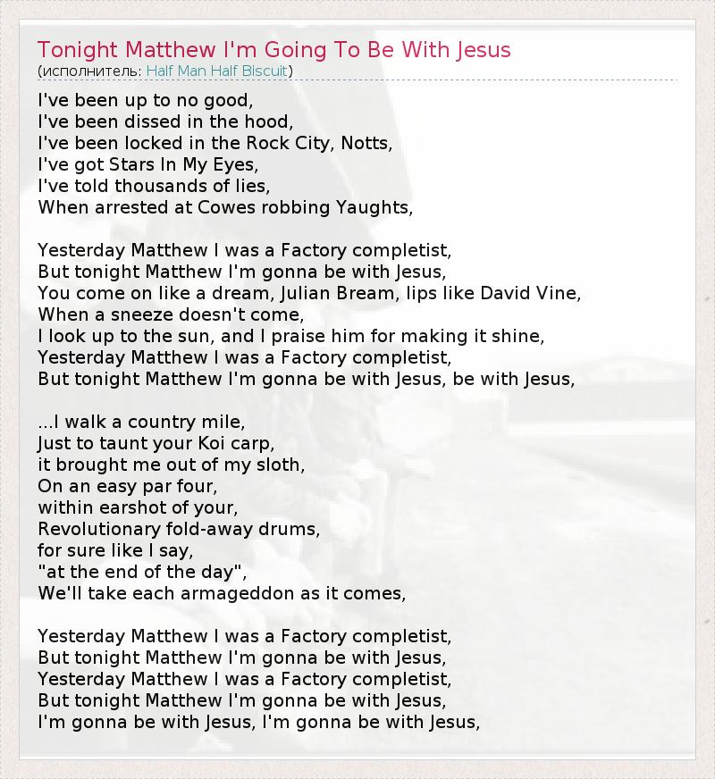 I've been up to no good, I've been dissed in the hood, I've been locked in the Rock City, Notts, I've got Stars In My Eyes, I've told thousands of lies, When arrested at Cowes robbing Yaughts, Yesterday Matthew I was a Factory completist, But tonight Matthew I'm gonna be with Jesus, You come on like a dream, Julian Bream, lips like David Vine, When a sneeze doesn't come, I look up to the sun, and I praise him for making it shine, Yesterday Matthew I was a Factory completist, But tonight Matthew I'm gonna be with Jesus, be with Jesus, ...I walk a country mile, Just to taunt your Koi carp, it brought me out of my sloth, On an easy par four, within earshot of your, Revolutionary fold-away drums, for sure like I say, "at the end of the day", We'll take each armageddon as it comes, Yesterday Matthew I was a Factory completist, But tonight Matthew I'm gonna be with Jesus, Yesterday Matthew I was a Factory completist, But tonight Matthew I'm gonna be with Jesus, I'm gonna be with Jesus, I'm gonna be with Jesus,