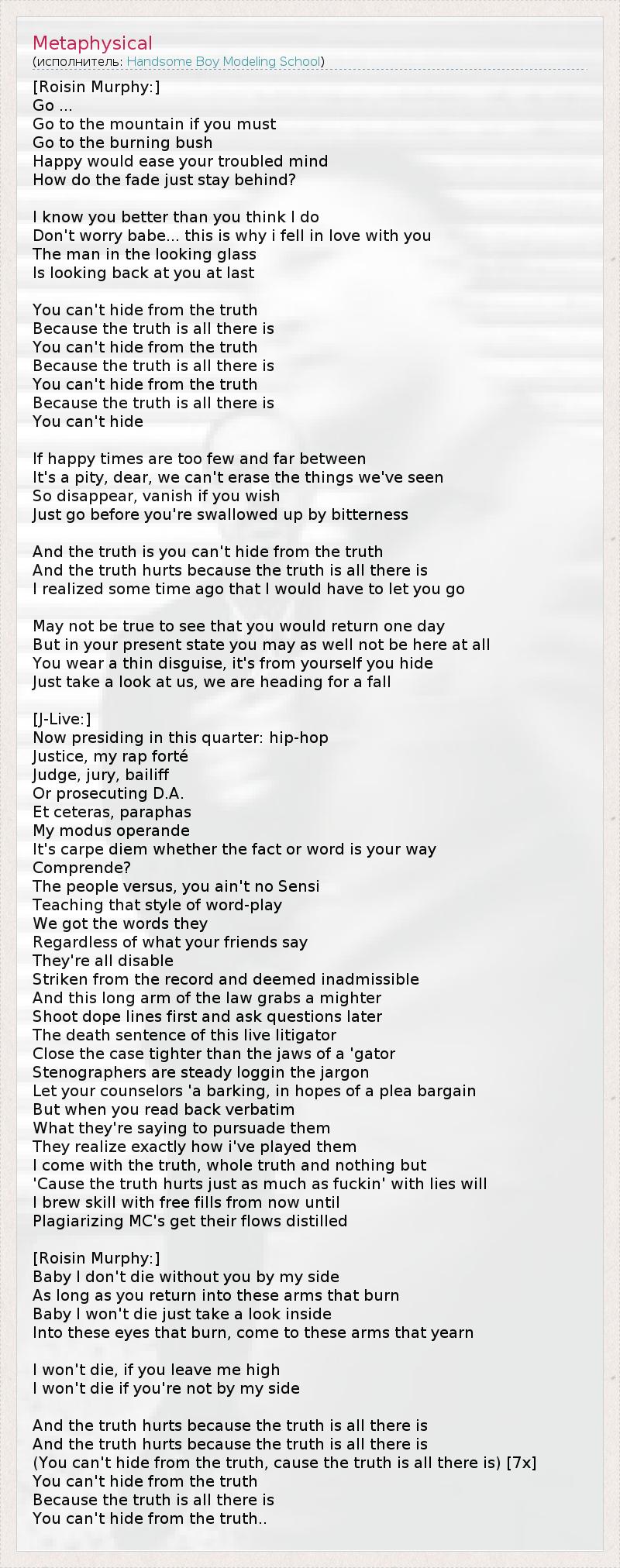 [Roisin Murphy:] Иди... Иди к горе, если тебе это необходимо, Иди к неопалимой купине*. Счастье могло бы облегчить твой беспокойный ум. Как же оставить позади увядание? Я знаю тебя лучше, чем ты думаешь. Не волнуйся, малыш... Вот почему я влюбилась в тебя. Ведь, в конце концов, отражение в зеркале Смотрит на тебя. Ты не сможешь скрыться от правды, Потому что правда - это все, что есть. Ты не сможешь скрыться от правды, Потому что правда - это все, что есть. Ты не сможешь скрыться от правды, Потому что правда - это все, что есть. Ты не сможешь скрыться. Если счастливых времен слишком мало, и они остались далеко, То очень жаль, дорогой, ведь мы не сможем стереть то, что видели. Так исчезай, пропадай, если ты этого хочешь, Просто уходи, пока тебя не поглотила горечь. А правда в том, что вы не сможешь скрыться от правды, И правда причиняет боль, потому что правда - это все, что есть. Недавно я поняла, что должна отпустить тебя. Может, это и неправда, что ты когда-нибудь вернешься, Но быть с тобой таким, какой ты есть сейчас, это все равно, что не быть с тобой вообще. Ты носишь почти незаметную маску, это от себя ты скрываешься. Просто взгляни на нас, мы приближаемся к краху. [J-Live:] Сейчас в этом доме председательствует хип-хоп. Правосудие - это мой мощный рэп. Судья, присяжные, судебный исполнитель Или представляющий обвинение окружной прокурор И другие подписавшиеся, Мой modus operande** - Это "Carpe Diem"***, и неважно факт или слово - ваш путь Comprende?**** Люди, что против, вы не сэнсэи. Обучая этому стилю игры слов, Мы используем слова, которые Не зависят от того, что говорят ваши друзья. Они все непригодны, Они слетают с записи и считаются недопустимыми, А эта длинная рука закона хватает самых лучших. Сначала стреляйте клевыми строчками, а потом уже задавайте вопросы. Смертный приговор для действующего адвоката: Закрой это дело сильнее, чем защелкивает свои челюсти аллигатор. Стенографистки спокойно записывают этот жаргон. Пусть твои защитники немного полают в надежде на сделку о признании вины, Но когда ты дословно все повторишь, Они попросят убедить их. Они понимают, как именно мне удалось их обыграть. Я прихожу с правдой, только правдой и ничем, кроме нее, Потому что правда причиняет боль так же, как это делает чертова ложь. Отныне я оттачиваю свое мастерство бесплатно, Пусть MC-плагиаторы получат чистые строки. [Roisin Murphy:] Малыш, я не умру, если тебя не будет рядом со мной, Пока ты не вернешься в эти пылающие объятия. Малыш, я не умру, просто загляни вовнутрь, В эти глаза, которые горят, приди в эти объятия, которые жаждут. Я не умру, если ты уйдешь, оставив меня на вершине блаженства, Я не умру, если тебя не будет рядом со мной. И правда причиняет боль, потому что правда - это все, что есть. И правда причиняет боль, потому что правда - это все, что есть. (Ты не сможешь скрыться от правды, потому что правда - это все, что есть.) [7x] Ты не сможешь скрыться от правды, Потому что правда - это все, что есть. Ты не сможешь скрыться от правды... * Горящий, но не сгорающий терновый куст, в котором Бог явился Моисею, пасшему овец в пустыне близ горы Синай. ** лат. – образ действия. Данная фраза используется в юриспруденции для описания способа совершения преступления. *** лат. – наслаждайся моментом. **** исп. – Понятно?