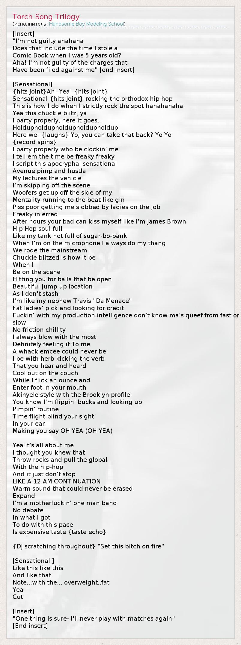 А как ты думаешь, о чем песня "Torch Song Trilogy" ?