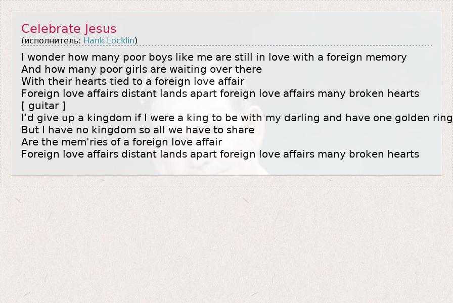 I wonder how many poor boys like me are still in love with a foreign memory And how many poor girls are waiting over there With their hearts tied to a foreign love affair Foreign love affairs distant lands apart foreign love affairs many broken hearts [ guitar ] I'd give up a kingdom if I were a king to be with my darling and have one golden ring But I have no kingdom so all we have to share Are the mem'ries of a foreign love affair Foreign love affairs distant lands apart foreign love affairs many broken hearts