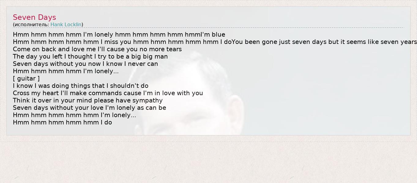 Это интересно:15 февраля 1918 — 8 марта 2009Лоуренс Хэнкинс Локлин, более известный как Хэнк Локлин — американский кантри-исполнитель, автор песен. Наиболее популярные песни — «Please Help Me, I’m Falling», «Send Me the Pillow That You Dream On», «Geisha Girl».Родился в бедной семье, поэтому с детства вынужден был работать, в том числе собирать хлопок на полях. Он начал играть на гитаре в возрасте девяти лет, когда лечился... продолжение