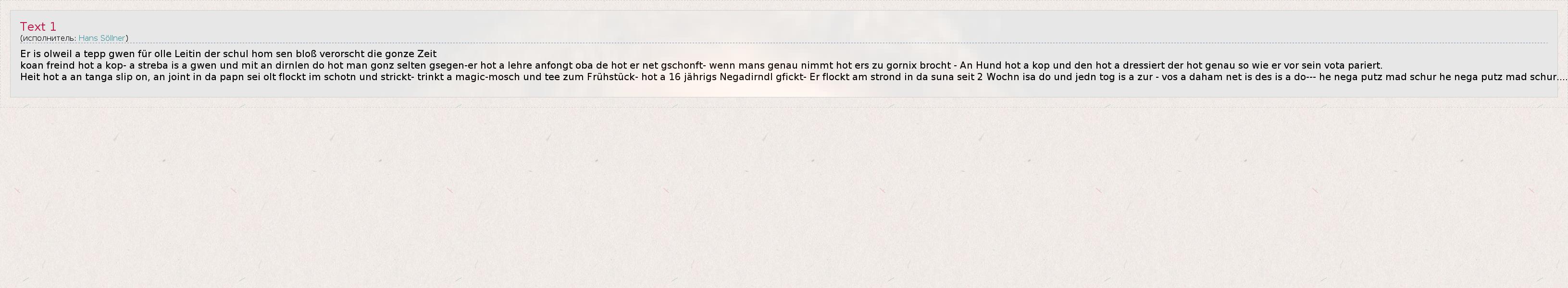 Er is olweil a tepp gwen für olle Leitin der schul hom sen bloß verorscht die gonze Zeit koan freind hot a kop- a streba is a gwen und mit an dirnlen do hot man gonz selten gsegen-er hot a lehre anfongt oba de hot er net gschonft- wenn mans genau nimmt hot ers zu gornix brocht - An Hund hot a kop und den hot a dressiert der hot genau so wie er vor sein vota pariert. Heit hot a an tanga slip on, an joint in da papn sei olt flockt im schotn und strickt- trinkt a magic-mosch und tee zum Frühstück- hot a 16 jährigs Negadirndl gfickt- Er flockt am strond in da suna seit 2 Wochn isa do und jedn tog is a zur - vos a daham net is des is a do--- he nega putz mad schur he nega putz mad schur....