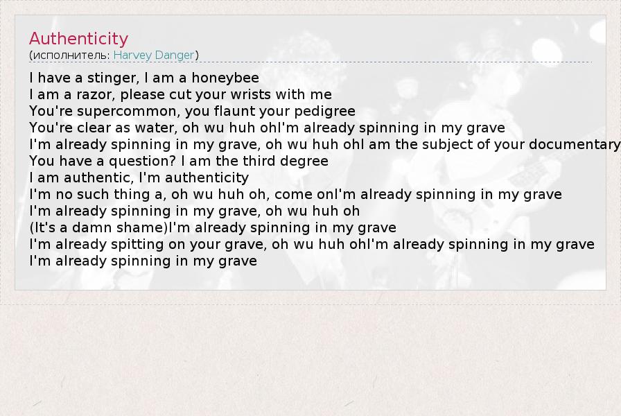 I have a stinger, I am a honeybee I am a razor, please cut your wrists with me You're supercommon, you flaunt your pedigree You're clear as water, oh wu huh ohI'm already spinning in my grave I'm already spinning in my grave, oh wu huh ohI am the subject of your documentary You have a question? I am the third degree I am authentic, I'm authenticity I'm no such thing a, oh wu huh oh, come onI'm already spinning in my grave I'm already spinning in my grave, oh wu huh oh (It's a damn shame)I'm already spinning in my grave I'm already spitting on your grave, oh wu huh ohI'm already spinning in my grave I'm already spinning in my grave