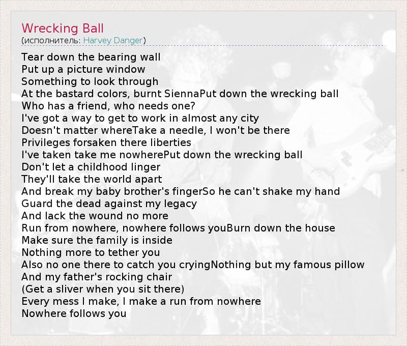 Tear down the bearing wall Put up a picture window Something to look through At the bastard colors, burnt SiennaPut down the wrecking ball Who has a friend, who needs one? I've got a way to get to work in almost any city Doesn't matter whereTake a needle, I won't be there Privileges forsaken there liberties I've taken take me nowherePut down the wrecking ball Don't let a childhood linger They'll take the world apart And break my baby brother's fingerSo he can't shake my hand Guard the dead against my legacy And lack the wound no more Run from nowhere, nowhere follows youBurn down the house Make sure the family is inside Nothing more to tether you Also no one there to catch you cryingNothing but my famous pillow And my father's rocking chair (Get a sliver when you sit there) Every mess I make, I make a run from nowhere Nowhere follows you