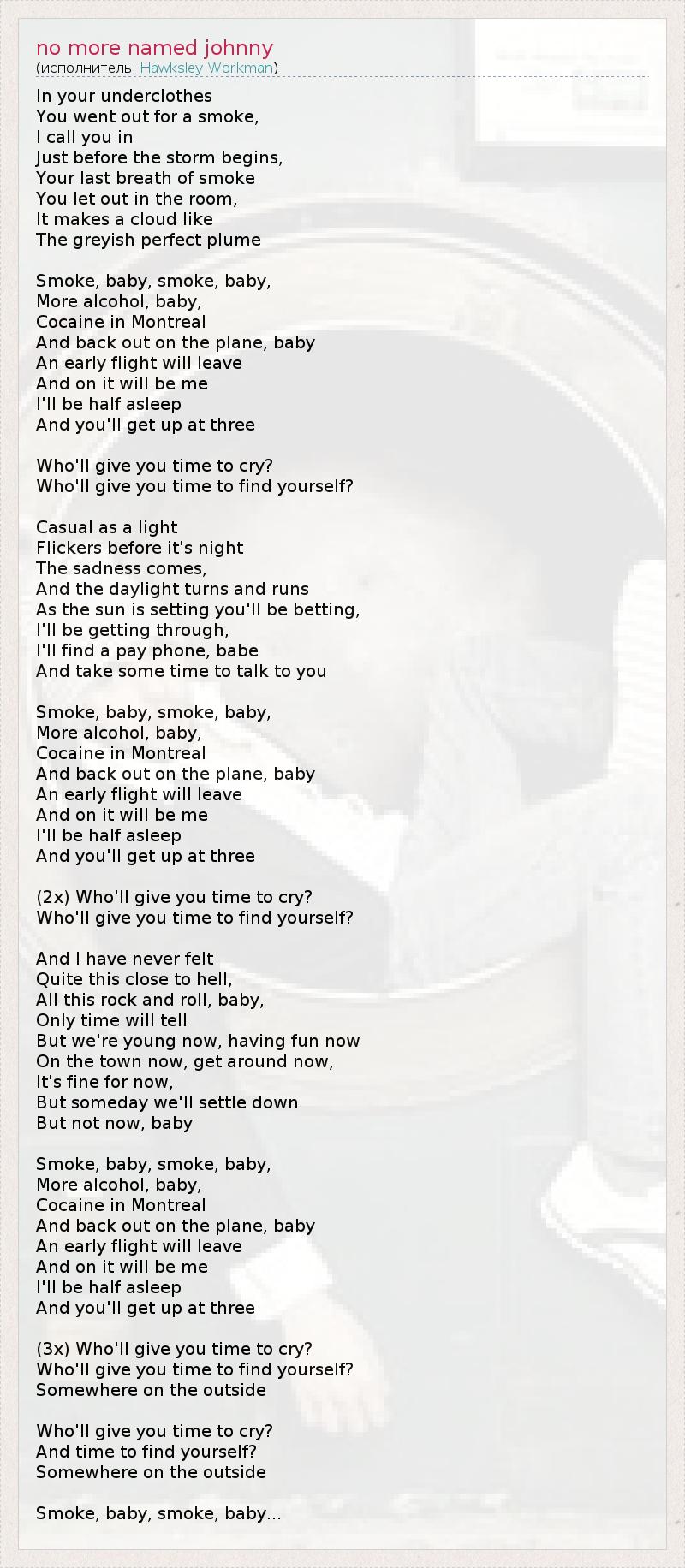 В нижнем белье Ты вышла покурить, Я зову тебя обратно, Пока не началась гроза, Дым от последней затяжки Ты выпускаешь в комнате, Он похож на Серый ровный столбик Кури, детка, кури, детка, Больше алкоголя, детка, Кокаин в Монреале И опять на самолет, детка, Ранний рейс вылетит, И я буду на нем, Я почти усну, А ты проснешься в три Кто даст тебе время на слёзы? Кто даст тебе время обрести себя? Привычный огонёк Вспыхивает, пока не стемнело, Становится грустно, И дневной свет убывает, Пока заходит солнце, ты будешь делать ставки, Я буду искать выход, Я найду телефон-автомат, детка, И время поговорить с тобой Кури, детка, кури, детка, Больше алкоголя, детка, Кокаин в Монреале И опять на самолет, детка, Ранний рейс вылетит, И я буду на нем, Я почти усну, А ты проснешься в три (2x) Кто даст тебе время на слёзы? Кто даст тебе время обрести себя? И я никогда не чувствовал, Насколько это похоже на ад, Весь этот рок-н-ролл, детка, Только время покажет, Но сейчас мы молоды, развлекаемся Где-то в городе, Пока это здорово, Но когда-нибудь мы угомонимся, Но только не сейчас, детка Кури, детка, кури, детка, Больше алкоголя, детка, Кокаин в Монреале И опять на самолет, детка, Ранний рейс вылетит, И я буду на нем, Я почти усну, А ты проснешься в три (3x) Кто даст тебе время на слёзы? Кто даст тебе время обрести себя? Где-либо в этом мире Кто даст тебе время на слёзы? И время обрести себя? Где-либо в этом мире Кури, детка, кури, детка...