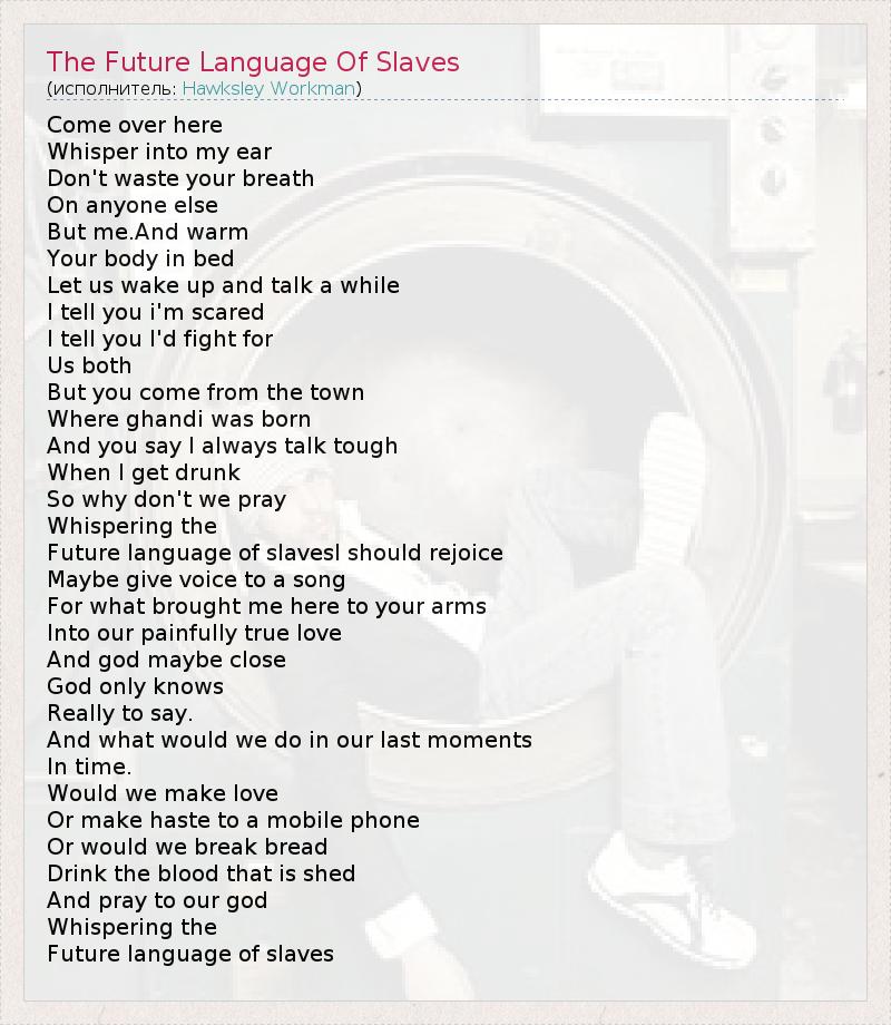 Come over here Whisper into my ear Don't waste your breath On anyone else But me.And warm Your body in bed Let us wake up and talk a while I tell you i'm scared I tell you I'd fight for Us both But you come from the town Where ghandi was born And you say I always talk tough When I get drunk So why don't we pray Whispering the Future language of slavesI should rejoice Maybe give voice to a song For what brought me here to your arms Into our painfully true love And god maybe close God only knows Really to say. And what would we do in our last moments In time. Would we make love Or make haste to a mobile phone Or would we break bread Drink the blood that is shed And pray to our god Whispering the Future language of slaves