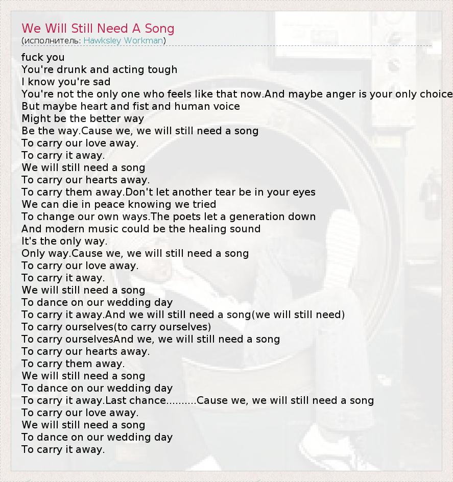 fuck you You're drunk and acting tough I know you're sad You're not the only one who feels like that now.And maybe anger is your only choice But maybe heart and fist and human voice Might be the better way Be the way.Cause we, we will still need a song To carry our love away. To carry it away. We will still need a song To carry our hearts away. To carry them away.Don't let another tear be in your eyes We can die in peace knowing we tried To change our own ways.The poets let a generation down And modern music could be the healing sound It's the only way. Only way.Cause we, we will still need a song To carry our love away. To carry it away. We will still need a song To dance on our wedding day To carry it away.And we will still need a song(we will still need) To carry ourselves(to carry ourselves) To carry ourselvesAnd we, we will still need a song To carry our hearts away. To carry them away. We will still need a song To dance on our wedding day To carry it away.Last chance..........Cause we, we will still need a song To carry our love away. We will still need a song To dance on our wedding day To carry it away.