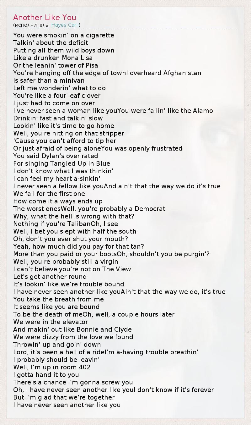 You were smokin' on a cigarette Talkin' about the deficit Putting all them wild boys down Like a drunken Mona Lisa Or the leanin' tower of Pisa You're hanging off the edge of townI overheard Afghanistan Is safer than a minivan Left me wonderin' what to do You're like a four leaf clover I just had to come on over I've never seen a woman like youYou were fallin' like the Alamo Drinkin' fast and talkin' slow Lookin' like it's time to go home Well, you're hitting on that stripper 'Cause you can't afford to tip her Or just afraid of being aloneYou was openly frustrated You said Dylan's over rated For singing Tangled Up In Blue I don't know what I was thinkin' I can feel my heart a-sinkin' I never seen a fellow like youAnd ain't that the way we do it's true We fall for the first one How come it always ends up The worst onesWell, you're probably a Democrat Why, what the hell is wrong with that? Nothing if you're TalibanOh, I see Well, I bet you slept with half the south Oh, don't you ever shut your mouth? Yeah, how much did you pay for that tan? More than you paid or your bootsOh, shouldn't you be purgin'? Well, you're probably still a virgin I can't believe you're not on The View Let's get another round It's lookin' like we're trouble bound I have never seen another like youAin't that the way we do, it's true You take the breath from me It seems like you are bound To be the death of meOh, well, a couple hours later We were in the elevator And makin' out like Bonnie and Clyde We were dizzy from the love we found Throwin' up and goin' down Lord, it's been a hell of a rideI'm a-having trouble breathin' I probably should be leavin' Well, I'm up in room 402 I gotta hand it to you There's a chance I'm gonna screw you Oh, I have never seen another like youI don't know if it's forever But I'm glad that we're together I have never seen another like you