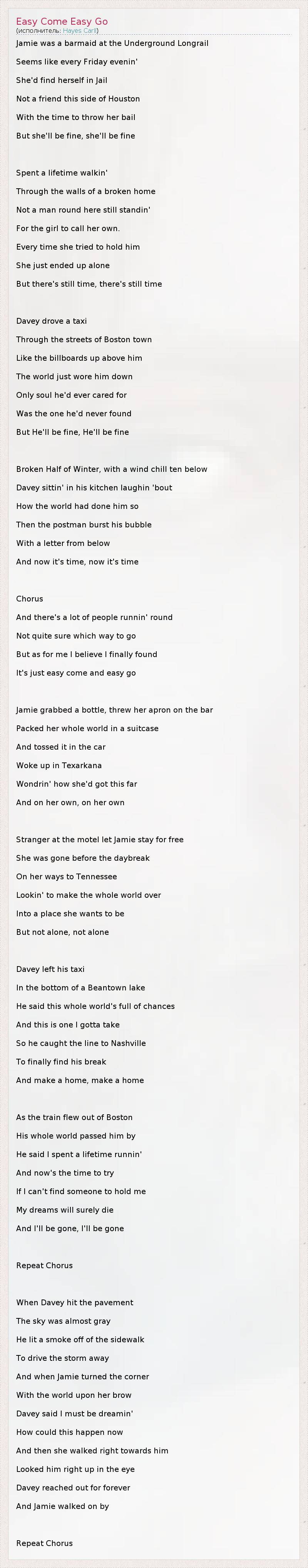 Jamie was a barmaid at the Underground Longrail Seems like every Friday evenin' She'd find herself in Jail Not a friend this side of Houston With the time to throw her bail But she'll be fine, she'll be fine Spent a lifetime walkin' Through the walls of a broken home Not a man round here still standin' For the girl to call her own. Every time she tried to hold him She just ended up alone But there's still time, there's still time Davey drove a taxi Through the streets of Boston town Like the billboards up above him The world just wore him down Only soul he'd ever cared for Was the one he'd never found But He'll be fine, He'll be fine Broken Half of Winter, with a wind chill ten below Davey sittin' in his kitchen laughin 'bout How the world had done him so Then the postman burst his bubble With a letter from below And now it's time, now it's time Chorus And there's a lot of people runnin' round Not quite sure which way to go But as for me I believe I finally found It's just easy come and easy go Jamie grabbed a bottle, threw her apron on the bar Packed her whole world in a suitcase And tossed it in the car Woke up in Texarkana Wondrin' how she'd got this far And on her own, on her own Stranger at the motel let Jamie stay for free She was gone before the daybreak On her ways to Tennessee Lookin' to make the whole world over Into a place she wants to be But not alone, not alone Davey left his taxi In the bottom of a Beantown lake He said this whole world's full of chances And this is one I gotta take So he caught the line to Nashville To finally find his break And make a home, make a home As the train flew out of Boston His whole world passed him by He said I spent a lifetime runnin' And now's the time to try If I can't find someone to hold me My dreams will surely die And I'll be gone, I'll be gone Repeat Chorus When Davey hit the pavement The sky was almost gray He lit a smoke off of the sidewalk To drive the storm away And when Jamie turned the corner With the world upon her brow Davey said I must be dreamin' How could this happen now And then she walked right towards him Looked him right up in the eye Davey reached out for forever And Jamie walked on by Repeat Chorus