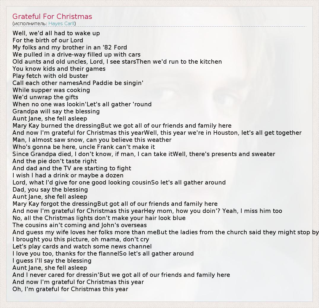 Well, we'd all had to wake up For the birth of our Lord My folks and my brother in an '82 Ford We pulled in a drive-way filled up with cars Old aunts and old uncles, Lord, I see starsThen we'd run to the kitchen You know kids and their games Play fetch with old buster Call each other namesAnd Paddie be singin' While supper was cooking We'd unwrap the gifts When no one was lookin'Let's all gather 'round Grandpa will say the blessing Aunt Jane, she fell asleep Mary Kay burned the dressingBut we got all of our friends and family here And now I'm grateful for Christmas this yearWell, this year we're in Houston, let's all get together Man, I almost saw snow, can you believe this weather Who's gonna be here, uncle Frank can't make it Since Grandpa died, I don't know, if man, I can take itWell, there's presents and sweater And the pie don't taste right And dad and the TV are starting to fight I wish I had a drink or maybe a dozen Lord, what I'd give for one good looking cousinSo let's all gather around Dad, you say the blessing Aunt Jane, she fell asleep Mary Kay forgot the dressingBut got all of our friends and family here And now I'm grateful for Christmas this yearHey mom, how you doin'? Yeah, I miss him too No, all the Christmas lights don't make your hair look blue The cousins ain't coming and John's overseas And guess my wife loves her folks more than meBut the ladies from the church said they might stop by I brought you this picture, oh mama, don't cry Let's play cards and watch some news channel I love you too, thanks for the flannelSo let's all gather around I guess I'll say the blessing Aunt Jane, she fell asleep And I never cared for dressin'But we got all of our friends and family here And now I'm grateful for Christmas this year Oh, I'm grateful for Christmas this year