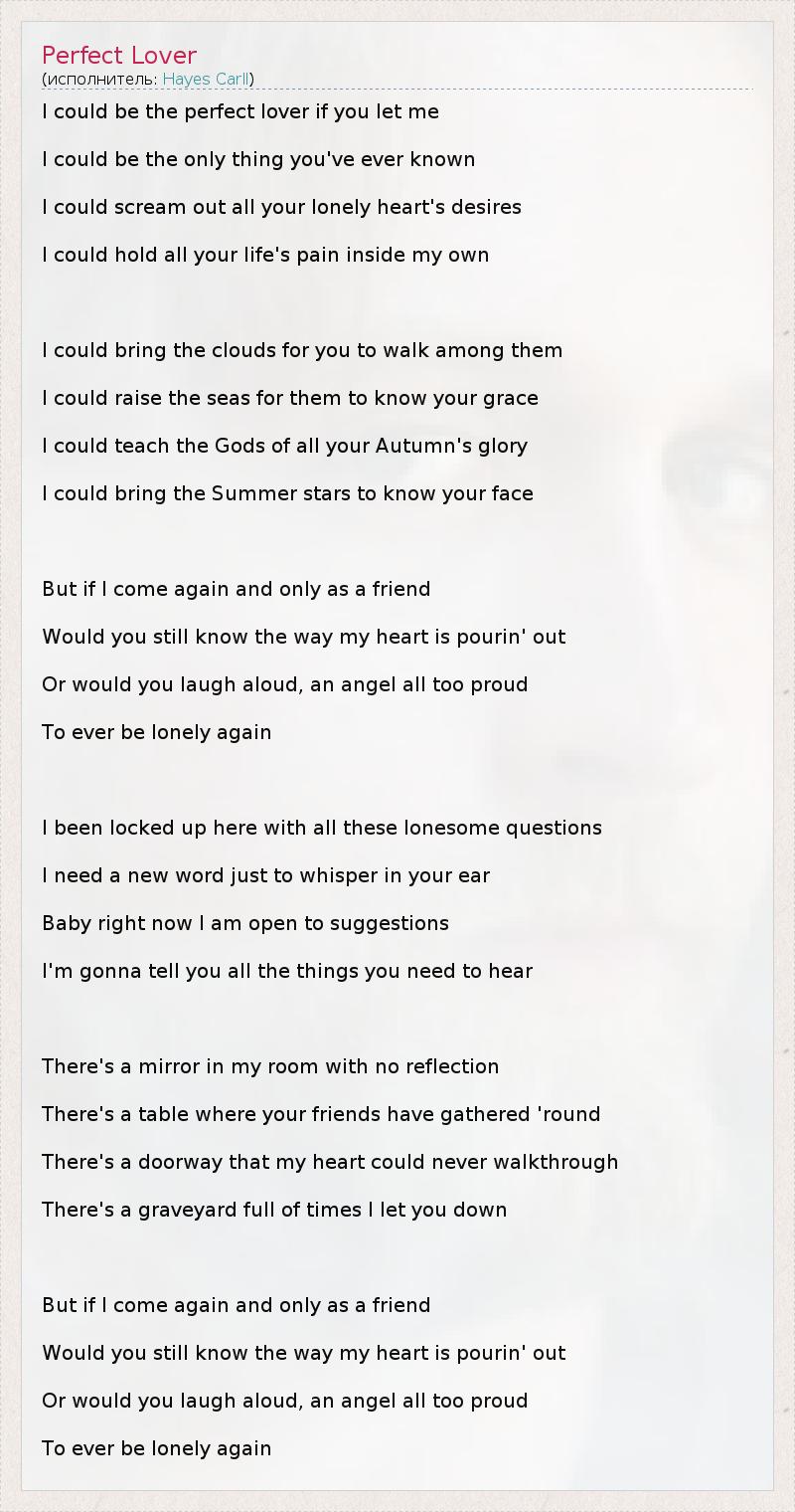 I could be the perfect lover if you let me I could be the only thing you've ever known I could scream out all your lonely heart's desires I could hold all your life's pain inside my own I could bring the clouds for you to walk among them I could raise the seas for them to know your grace I could teach the Gods of all your Autumn's glory I could bring the Summer stars to know your face But if I come again and only as a friend Would you still know the way my heart is pourin' out Or would you laugh aloud, an angel all too proud To ever be lonely again I been locked up here with all these lonesome questions I need a new word just to whisper in your ear Baby right now I am open to suggestions I'm gonna tell you all the things you need to hear There's a mirror in my room with no reflection There's a table where your friends have gathered 'round There's a doorway that my heart could never walkthrough There's a graveyard full of times I let you down But if I come again and only as a friend Would you still know the way my heart is pourin' out Or would you laugh aloud, an angel all too proud To ever be lonely again