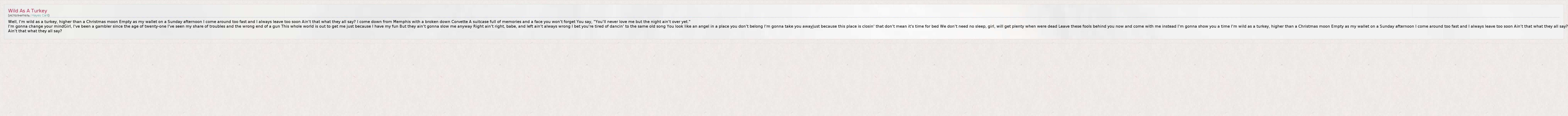 Well, I'm wild as a turkey, higher than a Christmas moon Empty as my wallet on a Sunday afternoon I come around too fast and I always leave too soon Ain't that what they all say? I come down from Memphis with a broken down Corvette A suitcase full of memories and a face you won't forget You say, "You'll never love me but the night ain't over yet." I'm gonna change your mindGirl, I've been a gambler since the age of twenty-one I've seen my share of troubles and the wrong end of a gun This whole world is out to get me just because I have my fun But they ain't gonna slow me anyway Right ain't right, babe, and left ain't always wrong I bet you're tired of dancin' to the same old song You look like an angel in a place you don't belong I'm gonna take you awayJust because this place is closin' that don't mean it's time for bed We don't need no sleep, girl, will get plenty when were dead Leave these fools behind you now and come with me instead I'm gonna show you a time I'm wild as a turkey, higher than a Christmas moon Empty as my wallet on a Sunday afternoon I come around too fast and I always leave too soon Ain't that what they all say? Ain't that what they all say?