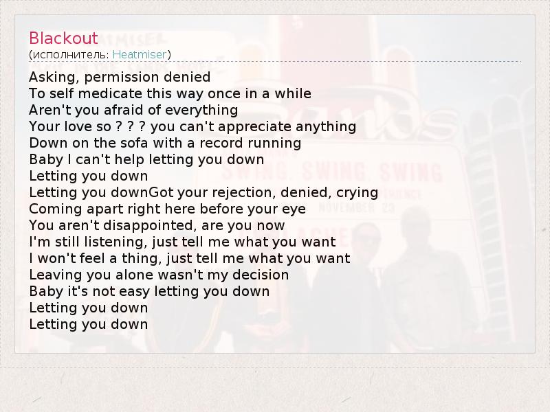 Asking, permission denied To self medicate this way once in a while Aren't you afraid of everything Your love so ? ? ? you can't appreciate anything Down on the sofa with a record running Baby I can't help letting you down Letting you down Letting you downGot your rejection, denied, crying Coming apart right here before your eye You aren't disappointed, are you now I'm still listening, just tell me what you want I won't feel a thing, just tell me what you want Leaving you alone wasn't my decision Baby it's not easy letting you down Letting you down Letting you down