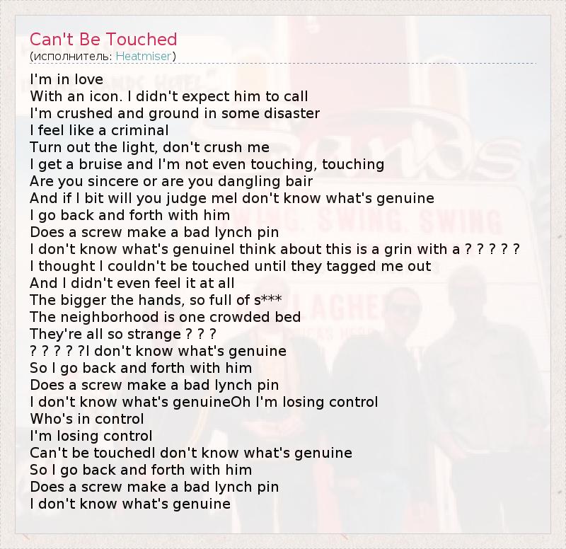 I'm in love With an icon. I didn't expect him to call I'm crushed and ground in some disaster I feel like a criminal Turn out the light, don't crush me I get a bruise and I'm not even touching, touching Are you sincere or are you dangling bair And if I bit will you judge meI don't know what's genuine I go back and forth with him Does a screw make a bad lynch pin I don't know what's genuineI think about this is a grin with a ? ? ? ? ? I thought I couldn't be touched until they tagged me out And I didn't even feel it at all The bigger the hands, so full of s*** The neighborhood is one crowded bed They're all so strange ? ? ? ? ? ? ? ?I don't know what's genuine So I go back and forth with him Does a screw make a bad lynch pin I don't know what's genuineOh I'm losing control Who's in control I'm losing control Can't be touchedI don't know what's genuine So I go back and forth with him Does a screw make a bad lynch pin I don't know what's genuine