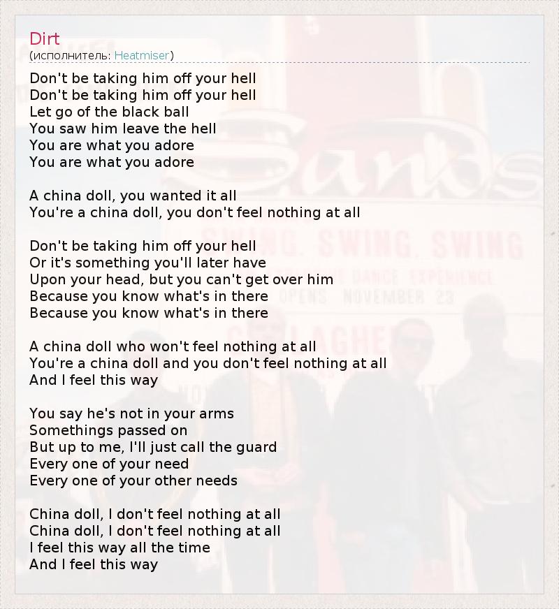 Don't be taking him off your hell Don't be taking him off your hell Let go of the black ball You saw him leave the hell You are what you adore You are what you adore A china doll, you wanted it all You're a china doll, you don't feel nothing at all Don't be taking him off your hell Or it's something you'll later have Upon your head, but you can't get over him Because you know what's in there Because you know what's in there A china doll who won't feel nothing at all You're a china doll and you don't feel nothing at all And I feel this way You say he's not in your arms Somethings passed on But up to me, I'll just call the guard Every one of your need Every one of your other needs China doll, I don't feel nothing at all China doll, I don't feel nothing at all I feel this way all the time And I feel this way