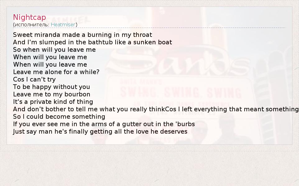 Sweet miranda made a burning in my throat And I'm slumped in the bathtub like a sunken boat So when will you leave me When will you leave me When will you leave me Leave me alone for a while? Cos I can't try To be happy without you Leave me to my bourbon It's a private kind of thing And don't bother to tell me what you really thinkCos I left everything that meant something So I could become something If you ever see me in the arms of a gutter out in the 'burbs Just say man he's finally getting all the love he deserves