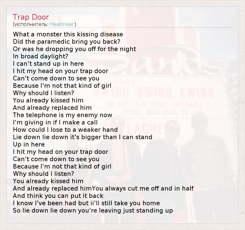 What a monster this kissing disease Did the paramedic bring you back? Or was he dropping you off for the night In broad daylight? I can't stand up in here I hit my head on your trap door Can't come down to see you Because I'm not that kind of girl Why should I listen? You already kissed him And already replaced him The telephone is my enemy now I'm giving in if I make a call How could I lose to a weaker hand Lie down lie down it's bigger than I can stand Up in here I hit my head on your trap door Can't come down to see you Because I'm not that kind of girl Why should I listen? You already kissed him And already replaced himYou always cut me off and in half And think you can put it back I know I've been had but ii'll still take you home So lie down lie down you're leaving just standing up