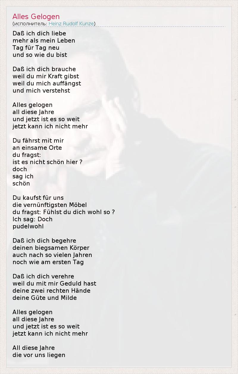 Daß ich dich liebe mehr als mein Leben Tag für Tag neu und so wie du bist Daß ich dich brauche weil du mir Kraft gibst weil du mich auffängst und mich verstehst Alles gelogen all diese Jahre und jetzt ist es so weit jetzt kann ich nicht mehr Du fährst mit mir an einsame Orte du fragst: ist es nicht schön hier ? doch sag ich schön Du kaufst für uns die vernünftigsten Möbel du fragst: Fühlst du dich wohl so ? Ich sag: Doch pudelwohl Daß ich dich begehre deinen biegsamen Körper auch nach so vielen Jahren noch wie am ersten Tag Daß ich dich verehre weil du mit mir Geduld hast deine zwei rechten Hände deine Güte und Milde Alles gelogen all diese Jahre und jetzt ist es so weit jetzt kann ich nicht mehr All diese Jahre die vor uns liegen