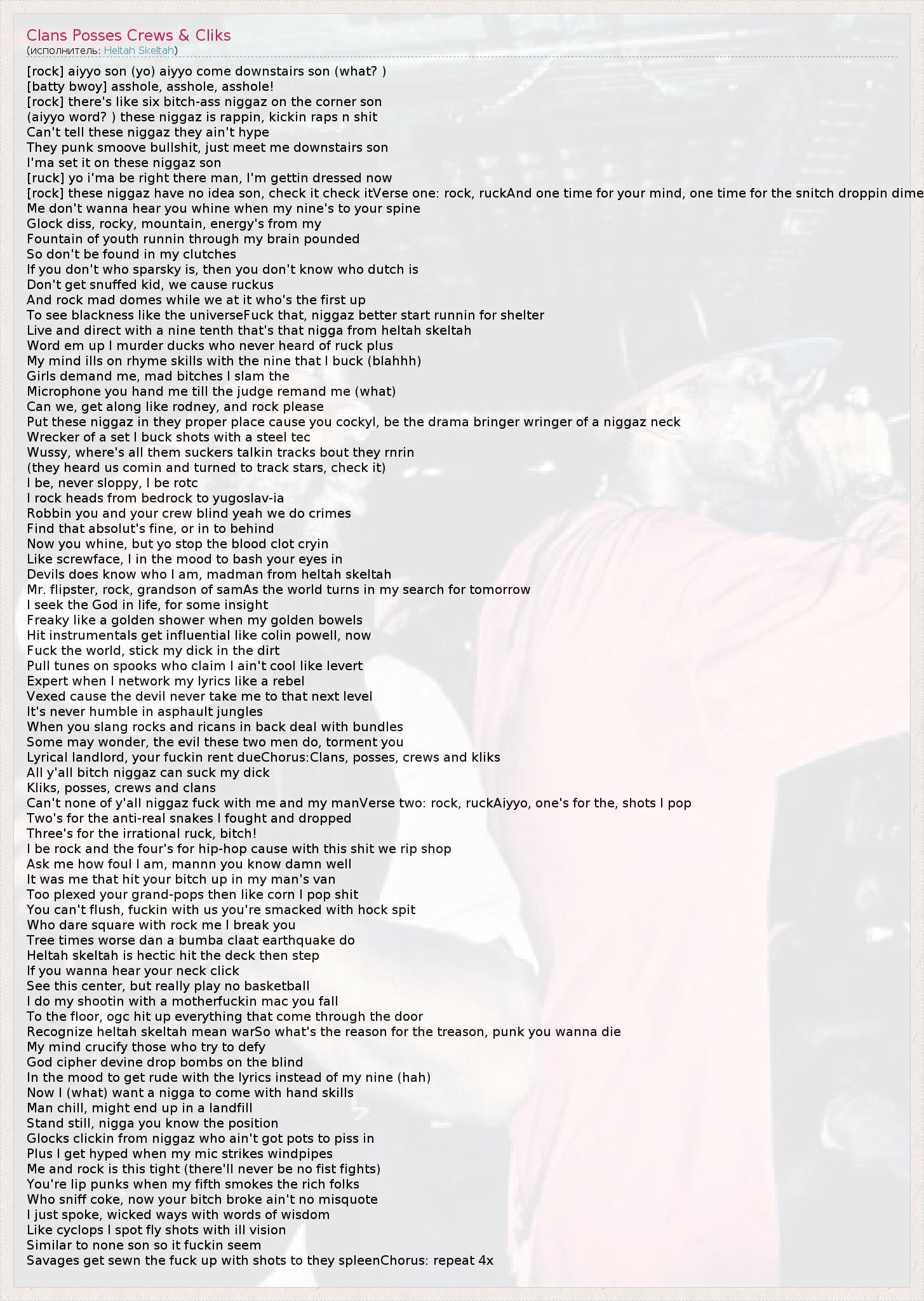 [rock] aiyyo son (yo) aiyyo come downstairs son (what? ) [batty bwoy] asshole, asshole, asshole! [rock] there's like six bitch-ass niggaz on the corner son (aiyyo word? ) these niggaz is rappin, kickin raps n shit Can't tell these niggaz they ain't hype They punk smoove bullshit, just meet me downstairs son I'ma set it on these niggaz son [ruck] yo i'ma be right there man, I'm gettin dressed now [rock] these niggaz have no idea son, check it check itVerse one: rock, ruckAnd one time for your mind, one time for the snitch droppin dime Me don't wanna hear you whine when my nine's to your spine Glock diss, rocky, mountain, energy's from my Fountain of youth runnin through my brain pounded So don't be found in my clutches If you don't who sparsky is, then you don't know who dutch is Don't get snuffed kid, we cause ruckus And rock mad domes while we at it who's the first up To see blackness like the universeFuck that, niggaz better start runnin for shelter Live and direct with a nine tenth that's that nigga from heltah skeltah Word em up I murder ducks who never heard of ruck plus My mind ills on rhyme skills with the nine that I buck (blahhh) Girls demand me, mad bitches I slam the Microphone you hand me till the judge remand me (what) Can we, get along like rodney, and rock please Put these niggaz in they proper place cause you cockyI, be the drama bringer wringer of a niggaz neck Wrecker of a set I buck shots with a steel tec Wussy, where's all them suckers talkin tracks bout they rnrin (they heard us comin and turned to track stars, check it) I be, never sloppy, I be rotc I rock heads from bedrock to yugoslav-ia Robbin you and your crew blind yeah we do crimes Find that absolut's fine, or in to behind Now you whine, but yo stop the blood clot cryin Like screwface, I in the mood to bash your eyes in Devils does know who I am, madman from heltah skeltah Mr. flipster, rock, grandson of samAs the world turns in my search for tomorrow I seek the God in life, for some insight Freaky like a golden shower when my golden bowels Hit instrumentals get influential like colin powell, now Fuck the world, stick my dick in the dirt Pull tunes on spooks who claim I ain't cool like levert Expert when I network my lyrics like a rebel Vexed cause the devil never take me to that next level It's never humble in asphault jungles When you slang rocks and ricans in back deal with bundles Some may wonder, the evil these two men do, torment you Lyrical landlord, your fuckin rent dueChorus:Clans, posses, crews and kliks All y'all bitch niggaz can suck my dick Kliks, posses, crews and clans Can't none of y'all niggaz fuck with me and my manVerse two: rock, ruckAiyyo, one's for the, shots I pop Two's for the anti-real snakes I fought and dropped Three's for the irrational ruck, bitch! I be rock and the four's for hip-hop cause with this shit we rip shop Ask me how foul I am, mannn you know damn well It was me that hit your bitch up in my man's van Too plexed your grand-pops then like corn I pop shit You can't flush, fuckin with us you're smacked with hock spit Who dare square with rock me I break you Tree times worse dan a bumba claat earthquake do Heltah skeltah is hectic hit the deck then step If you wanna hear your neck click See this center, but really play no basketball I do my shootin with a motherfuckin mac you fall To the floor, ogc hit up everything that come through the door Recognize heltah skeltah mean warSo what's the reason for the treason, punk you wanna die My mind crucify those who try to defy God cipher devine drop bombs on the blind In the mood to get rude with the lyrics instead of my nine (hah) Now I (what) want a nigga to come with hand skills Man chill, might end up in a landfill Stand still, nigga you know the position Glocks clickin from niggaz who ain't got pots to piss in Plus I get hyped when my mic strikes windpipes Me and rock is this tight (there'll never be no fist fights) You're lip punks when my fifth smokes the rich folks Who sniff coke, now your bitch broke ain't no misquote I just spoke, wicked ways with words of wisdom Like cyclops I spot fly shots with ill vision Similar to none son so it fuckin seem Savages get sewn the fuck up with shots to they spleenChorus: repeat 4x