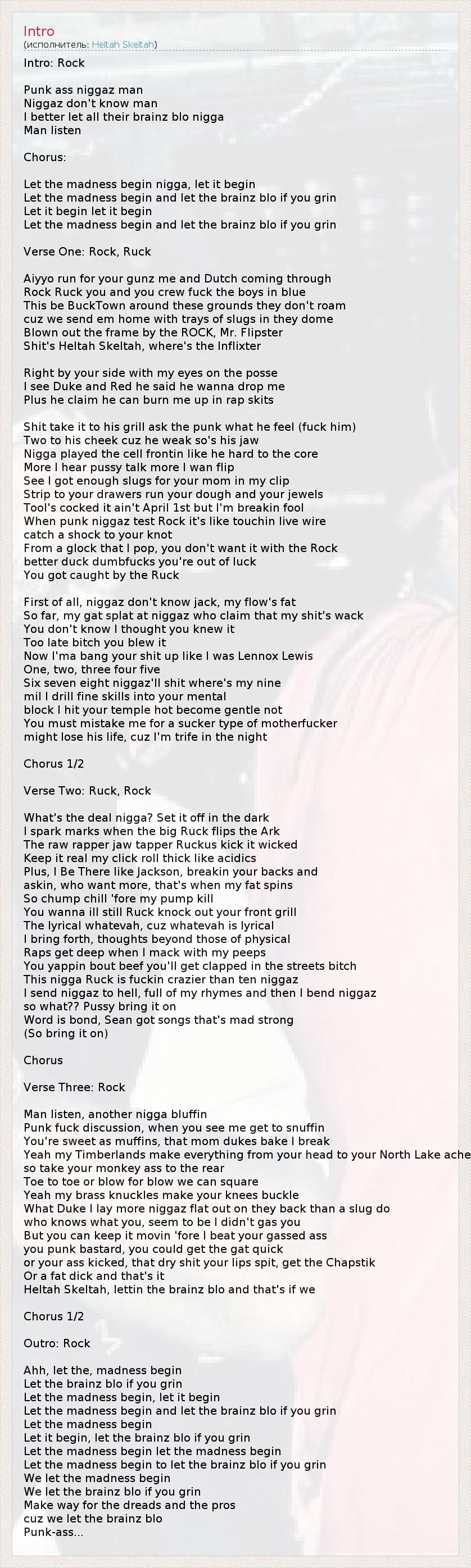 Intro: Rock Punk ass niggaz man Niggaz don't know man I better let all their brainz blo nigga Man listen Chorus: Let the madness begin nigga, let it begin Let the madness begin and let the brainz blo if you grin Let it begin let it begin Let the madness begin and let the brainz blo if you grin Verse One: Rock, Ruck Aiyyo run for your gunz me and Dutch coming through Rock Ruck you and you crew fuck the boys in blue This be BuckTown around these grounds they don't roam cuz we send em home with trays of slugs in they dome Blown out the frame by the ROCK, Mr. Flipster Shit's Heltah Skeltah, where's the Inflixter Right by your side with my eyes on the posse I see Duke and Red he said he wanna drop me Plus he claim he can burn me up in rap skits Shit take it to his grill ask the punk what he feel (fuck him) Two to his cheek cuz he weak so's his jaw Nigga played the cell frontin like he hard to the core More I hear pussy talk more I wan flip See I got enough slugs for your mom in my clip Strip to your drawers run your dough and your jewels Tool's cocked it ain't April 1st but I'm breakin fool When punk niggaz test Rock it's like touchin live wire catch a shock to your knot From a glock that I pop, you don't want it with the Rock better duck dumbfucks you're out of luck You got caught by the Ruck First of all, niggaz don't know jack, my flow's fat So far, my gat splat at niggaz who claim that my shit's wack You don't know I thought you knew it Too late bitch you blew it Now I'ma bang your shit up like I was Lennox Lewis One, two, three four five Six seven eight niggaz'll shit where's my nine mil I drill fine skills into your mental block I hit your temple hot become gentle not You must mistake me for a sucker type of motherfucker might lose his life, cuz I'm trife in the night Chorus 1/2 Verse Two: Ruck, Rock What's the deal nigga? Set it off in the dark I spark marks when the big Ruck flips the Ark The raw rapper jaw tapper Ruckus kick it wicked Keep it real my click roll thick like acidics Plus, I Be There like Jackson, breakin your backs and askin, who want more, that's when my fat spins So chump chill 'fore my pump kill You wanna ill still Ruck knock out your front grill The lyrical whatevah, cuz whatevah is lyrical I bring forth, thoughts beyond those of physical Raps get deep when I mack with my peeps You yappin bout beef you'll get clapped in the streets bitch This nigga Ruck is fuckin crazier than ten niggaz I send niggaz to hell, full of my rhymes and then I bend niggaz so what?? Pussy bring it on Word is bond, Sean got songs that's mad strong (So bring it on) Chorus Verse Three: Rock Man listen, another nigga bluffin Punk fuck discussion, when you see me get to snuffin You're sweet as muffins, that mom dukes bake I break Yeah my Timberlands make everything from your head to your North Lake ache so take your monkey ass to the rear Toe to toe or blow for blow we can square Yeah my brass knuckles make your knees buckle What Duke I lay more niggaz flat out on they back than a slug do who knows what you, seem to be I didn't gas you But you can keep it movin 'fore I beat your gassed ass you punk bastard, you could get the gat quick or your ass kicked, that dry shit your lips spit, get the Chapstik Or a fat dick and that's it Heltah Skeltah, lettin the brainz blo and that's if we Chorus 1/2 Outro: Rock Ahh, let the, madness begin Let the brainz blo if you grin Let the madness begin, let it begin Let the madness begin and let the brainz blo if you grin Let the madness begin Let it begin, let the brainz blo if you grin Let the madness begin let the madness begin Let the madness begin to let the brainz blo if you grin We let the madness begin We let the brainz blo if you grin Make way for the dreads and the pros cuz we let the brainz blo Punk-ass...
