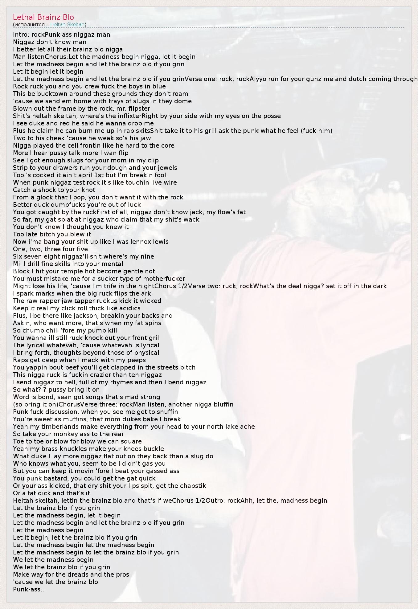 Intro: rockPunk ass niggaz man Niggaz don't know man I better let all their brainz blo nigga Man listenChorus:Let the madness begin nigga, let it begin Let the madness begin and let the brainz blo if you grin Let it begin let it begin Let the madness begin and let the brainz blo if you grinVerse one: rock, ruckAiyyo run for your gunz me and dutch coming through Rock ruck you and you crew fuck the boys in blue This be bucktown around these grounds they don't roam 'cause we send em home with trays of slugs in they dome Blown out the frame by the rock, mr. flipster Shit's heltah skeltah, where's the inflixterRight by your side with my eyes on the posse I see duke and red he said he wanna drop me Plus he claim he can burn me up in rap skitsShit take it to his grill ask the punk what he feel (fuck him) Two to his cheek 'cause he weak so's his jaw Nigga played the cell frontin like he hard to the core More I hear pussy talk more I wan flip See I got enough slugs for your mom in my clip Strip to your drawers run your dough and your jewels Tool's cocked it ain't april 1st but I'm breakin fool When punk niggaz test rock it's like touchin live wire Catch a shock to your knot From a glock that I pop, you don't want it with the rock Better duck dumbfucks you're out of luck You got caught by the ruckFirst of all, niggaz don't know jack, my flow's fat So far, my gat splat at niggaz who claim that my shit's wack You don't know I thought you knew it Too late bitch you blew it Now i'ma bang your shit up like I was lennox lewis One, two, three four five Six seven eight niggaz'll shit where's my nine Mil I drill fine skills into your mental Block I hit your temple hot become gentle not You must mistake me for a sucker type of motherfucker Might lose his life, 'cause I'm trife in the nightChorus 1/2Verse two: ruck, rockWhat's the deal nigga? set it off in the dark I spark marks when the big ruck flips the ark The raw rapper jaw tapper ruckus kick it wicked Keep it real my click roll thick like acidics Plus, I be there like jackson, breakin your backs and Askin, who want more, that's when my fat spins So chump chill 'fore my pump kill You wanna ill still ruck knock out your front grill The lyrical whatevah, 'cause whatevah is lyrical I bring forth, thoughts beyond those of physical Raps get deep when I mack with my peeps You yappin bout beef you'll get clapped in the streets bitch This nigga ruck is fuckin crazier than ten niggaz I send niggaz to hell, full of my rhymes and then I bend niggaz So what? ? pussy bring it on Word is bond, sean got songs that's mad strong (so bring it on)ChorusVerse three: rockMan listen, another nigga bluffin Punk fuck discussion, when you see me get to snuffin You're sweet as muffins, that mom dukes bake I break Yeah my timberlands make everything from your head to your north lake ache So take your monkey ass to the rear Toe to toe or blow for blow we can square Yeah my brass knuckles make your knees buckle What duke I lay more niggaz flat out on they back than a slug do Who knows what you, seem to be I didn't gas you But you can keep it movin 'fore I beat your gassed ass You punk bastard, you could get the gat quick Or your ass kicked, that dry shit your lips spit, get the chapstik Or a fat dick and that's it Heltah skeltah, lettin the brainz blo and that's if weChorus 1/2Outro: rockAhh, let the, madness begin Let the brainz blo if you grin Let the madness begin, let it begin Let the madness begin and let the brainz blo if you grin Let the madness begin Let it begin, let the brainz blo if you grin Let the madness begin let the madness begin Let the madness begin to let the brainz blo if you grin We let the madness begin We let the brainz blo if you grin Make way for the dreads and the pros 'cause we let the brainz blo Punk-ass...