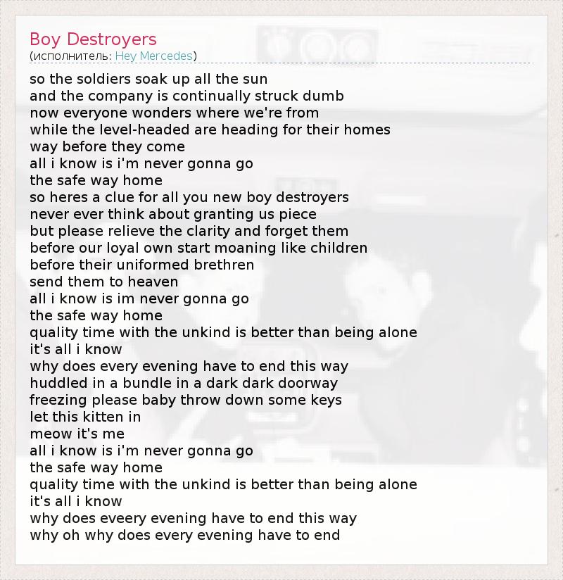 so the soldiers soak up all the sun and the company is continually struck dumb now everyone wonders where we're from while the level-headed are heading for their homes way before they come all i know is i'm never gonna go the safe way home so heres a clue for all you new boy destroyers never ever think about granting us piece but please relieve the clarity and forget them before our loyal own start moaning like children before their uniformed brethren send them to heaven all i know is im never gonna go the safe way home quality time with the unkind is better than being alone it's all i know why does every evening have to end this way huddled in a bundle in a dark dark doorway freezing please baby throw down some keys let this kitten in meow it's me all i know is i'm never gonna go the safe way home quality time with the unkind is better than being alone it's all i know why does eveery evening have to end this way why oh why does every evening have to end