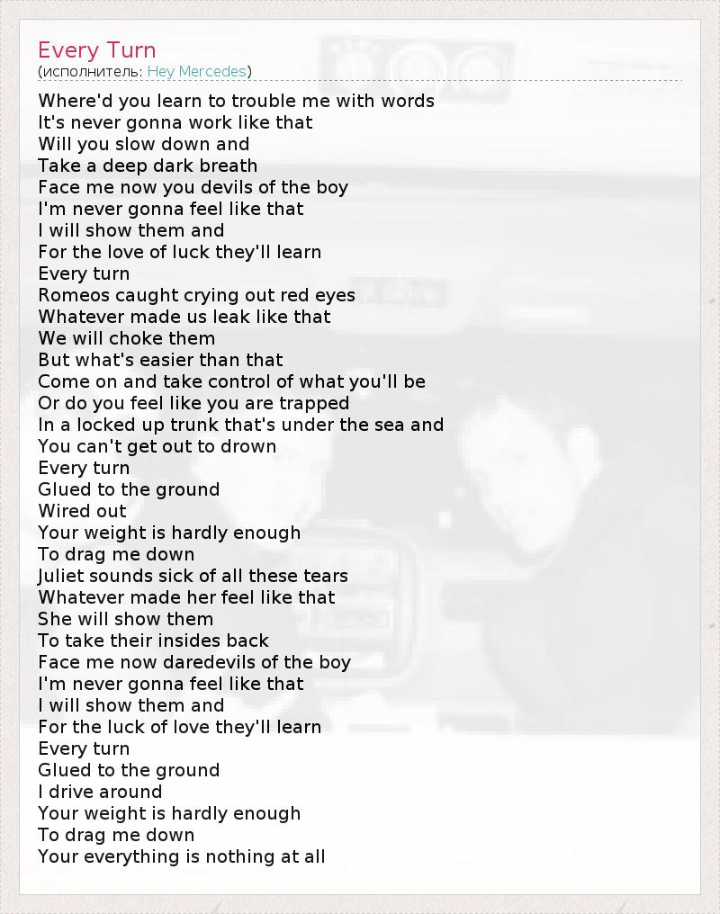 Where'd you learn to trouble me with words It's never gonna work like that Will you slow down and Take a deep dark breath Face me now you devils of the boy I'm never gonna feel like that I will show them and For the love of luck they'll learn Every turn Romeos caught crying out red eyes Whatever made us leak like that We will choke them But what's easier than that Come on and take control of what you'll be Or do you feel like you are trapped In a locked up trunk that's under the sea and You can't get out to drown Every turn Glued to the ground Wired out Your weight is hardly enough To drag me down Juliet sounds sick of all these tears Whatever made her feel like that She will show them To take their insides back Face me now daredevils of the boy I'm never gonna feel like that I will show them and For the luck of love they'll learn Every turn Glued to the ground I drive around Your weight is hardly enough To drag me down Your everything is nothing at all