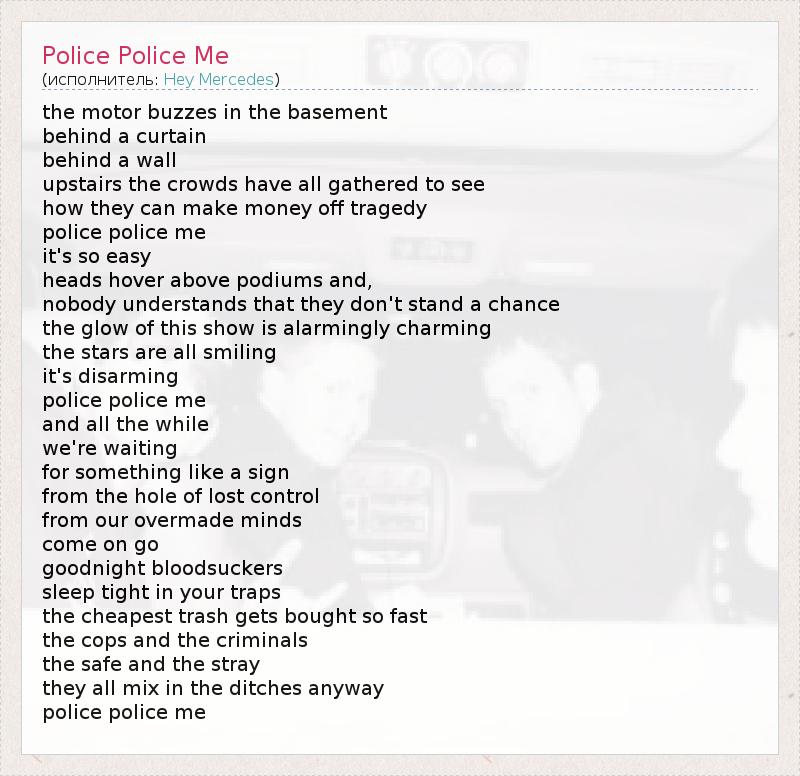 the motor buzzes in the basement behind a curtain behind a wall upstairs the crowds have all gathered to see how they can make money off tragedy police police me it's so easy heads hover above podiums and, nobody understands that they don't stand a chance the glow of this show is alarmingly charming the stars are all smiling it's disarming police police me and all the while we're waiting for something like a sign from the hole of lost control from our overmade minds come on go goodnight bloodsuckers sleep tight in your traps the cheapest trash gets bought so fast the cops and the criminals the safe and the stray they all mix in the ditches anyway police police me